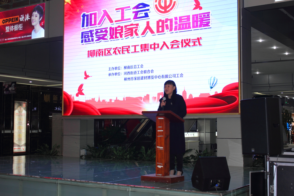 11月21日上午,在柳州家居一號館中庭,河西街道攜手柳州市家居建材博覽中心有限公司工會聯合開展“柳南區農民工集中入會儀式”。十位來自柳州家居·家之寶的農民工會員代表領到了會員證,加入了工會組織。