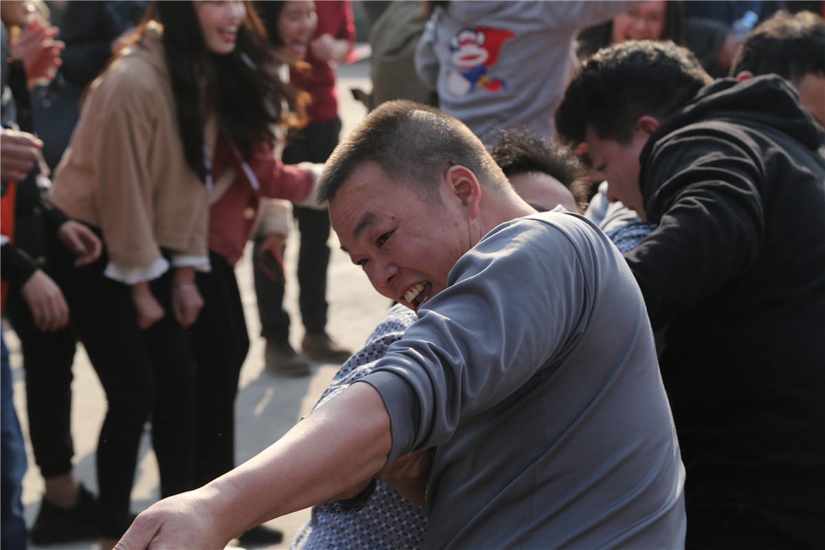 當(dāng)比賽的哨聲響起,參賽人員緊握長(zhǎng)繩,卯足勁拼命往后拉!旁觀的人員也情緒高漲,自發(fā)組成拉拉隊(duì)為比賽人員吶喊,哨子聲、吶喊聲不絕于耳,整個(gè)廣場(chǎng)上沸反盈天。