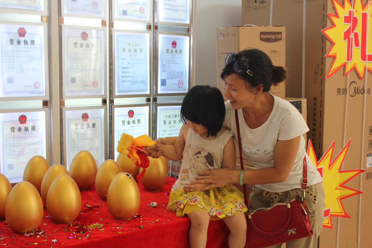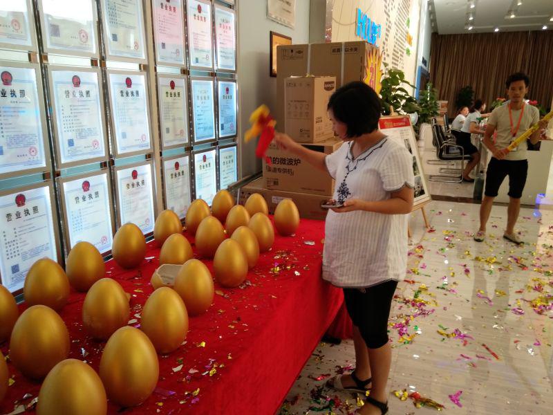 當(dāng)天簽約的客戶,交2000元預(yù)約現(xiàn)金可以砸金蛋一個(gè),交5000元預(yù)約金可以砸金蛋2個(gè),交10000元預(yù)約金可以砸金蛋3個(gè),金蛋內(nèi)有長虹50寸液晶電視、美的冰箱、榮事達(dá)滾筒洗衣機(jī)、奧克斯空調(diào)、電飯煲、微波爐、電磁爐、掛燙機(jī)。今天就有業(yè)主砸出了空調(diào)和掛燙機(jī)