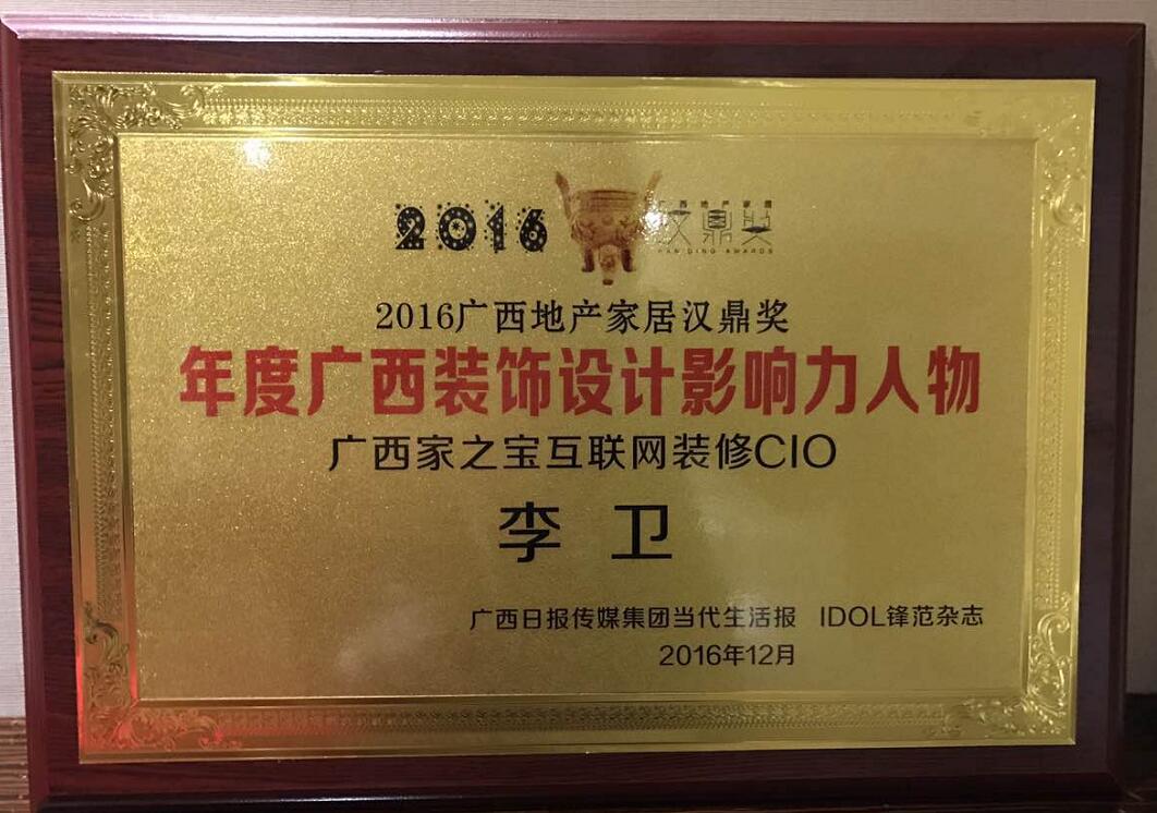 2016年12月26日(星期一18:00-21:30),2016廣西地產家居漢鼎獎頒獎盛典在南寧市沃頓國際大酒店國宴廳舉行。來自房產裝飾行業的各品牌代表出席了盛典。家之寶互聯網裝修獲得了“2016年度廣西裝飾行業愛心公益事業獎”。家之寶互聯網裝修總監李衛獲得了“2016年度廣西裝飾設計影響力人物獎”。