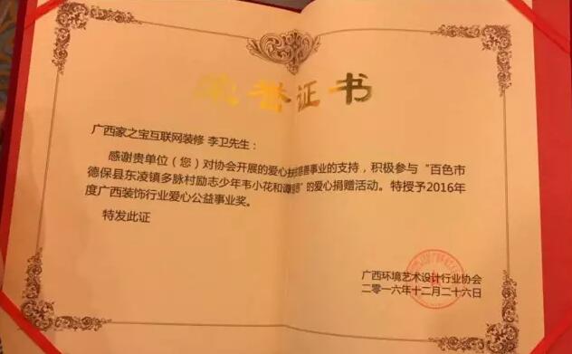 家之寶互聯網裝修獲得“2016年度廣西裝飾行業愛心公益事業獎”