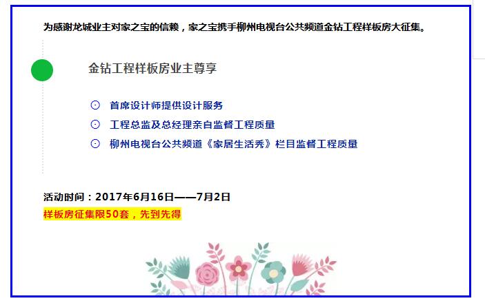 家之寶作為龍城一站式裝修領導品牌,龍城百姓信賴的裝飾品牌,特開展2017夏季家裝工藝設計文化展,以方便業主了解學習裝修,讓各位業主從裝修菜鳥變專家!