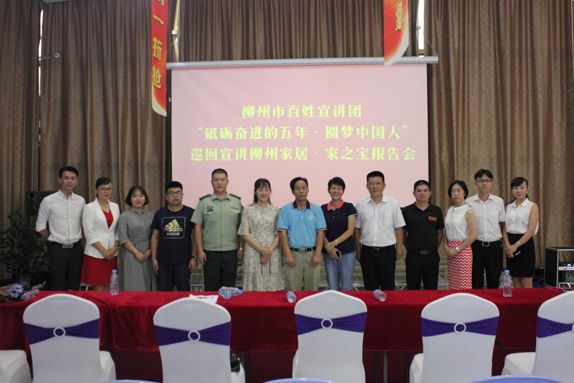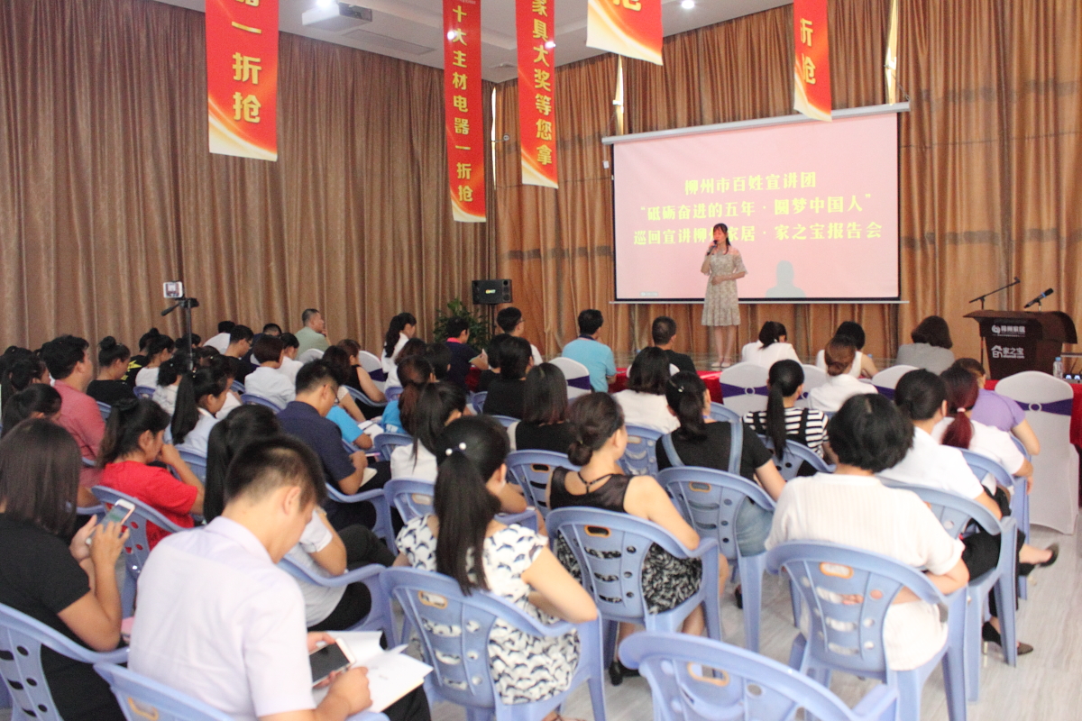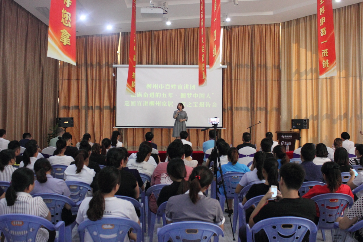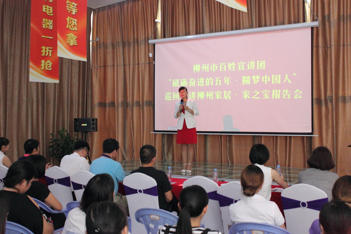 9月18日下午,在柳州市委講師團副團長藍紹才、市工商聯辦公室主任石悄平的帶領下,柳州市百姓宣講團走進柳州家居·家之寶,開展“砥礪奮進的五年·圓夢中國人”巡回宣講活動。此次宣講活動由柳州家居·家之寶總裁助理劉小兵主持。5名宣講員為80多位柳州家居·家之寶的商戶及員工帶來了一個又一個感人事跡的精彩宣講。