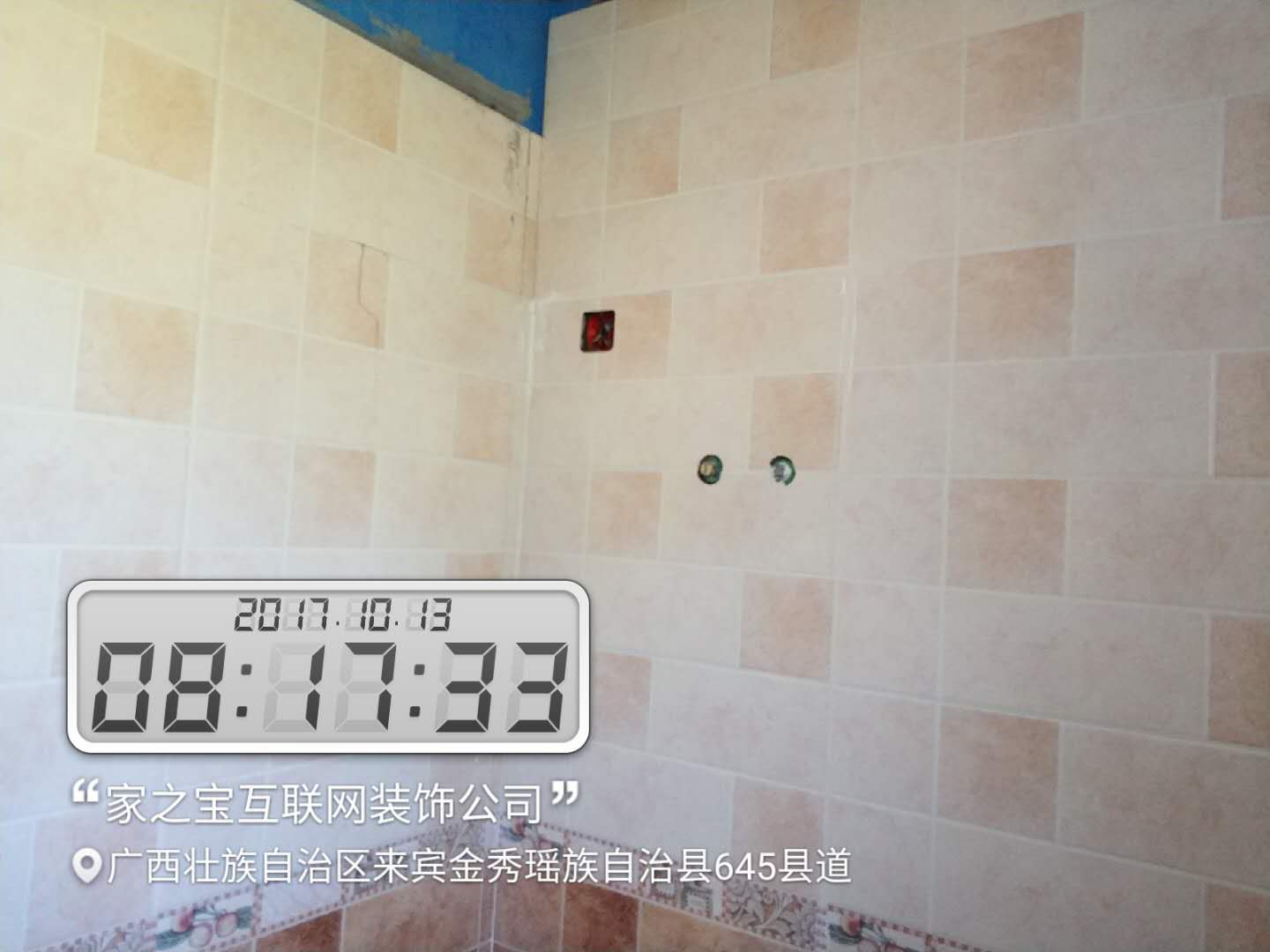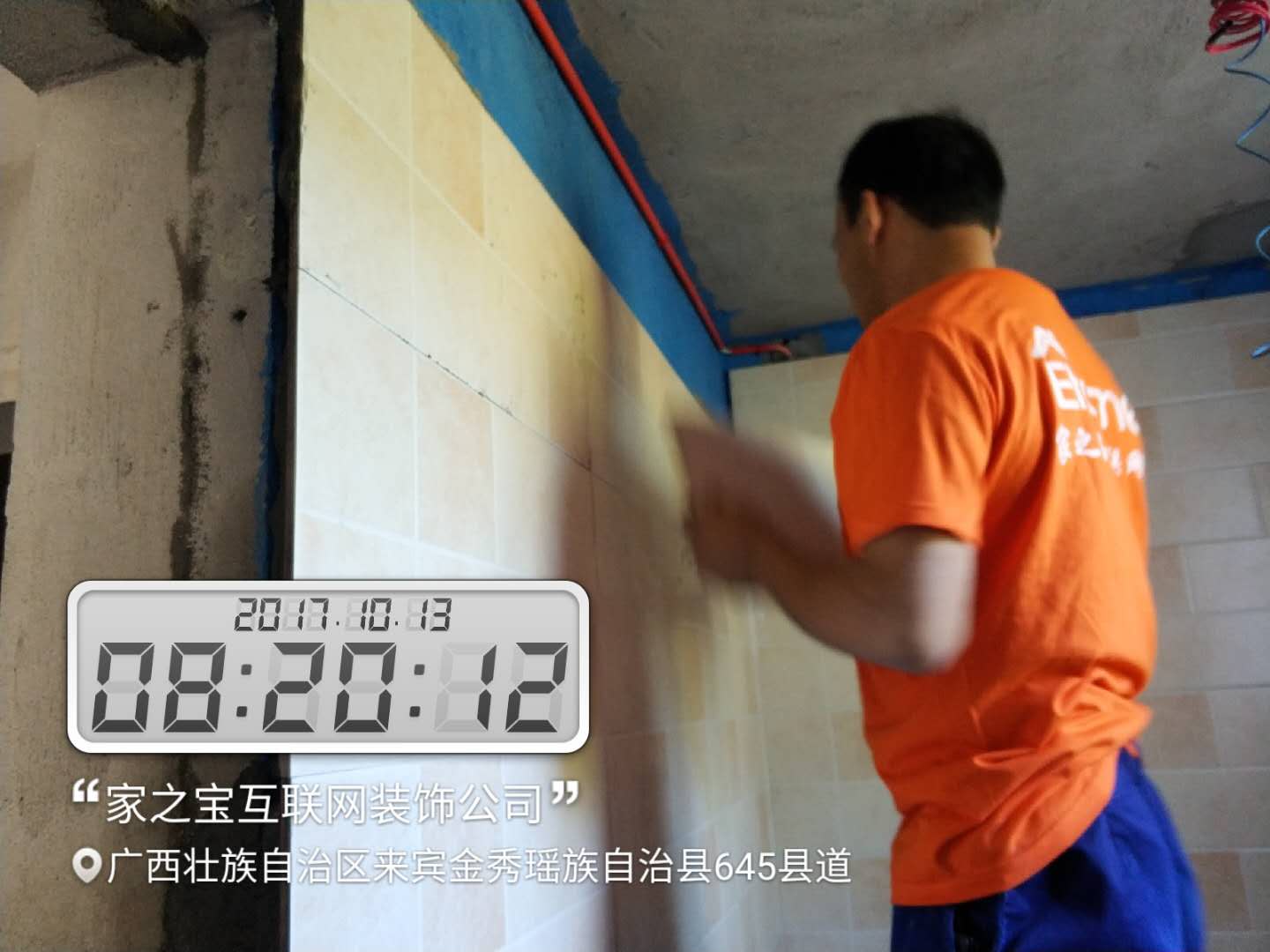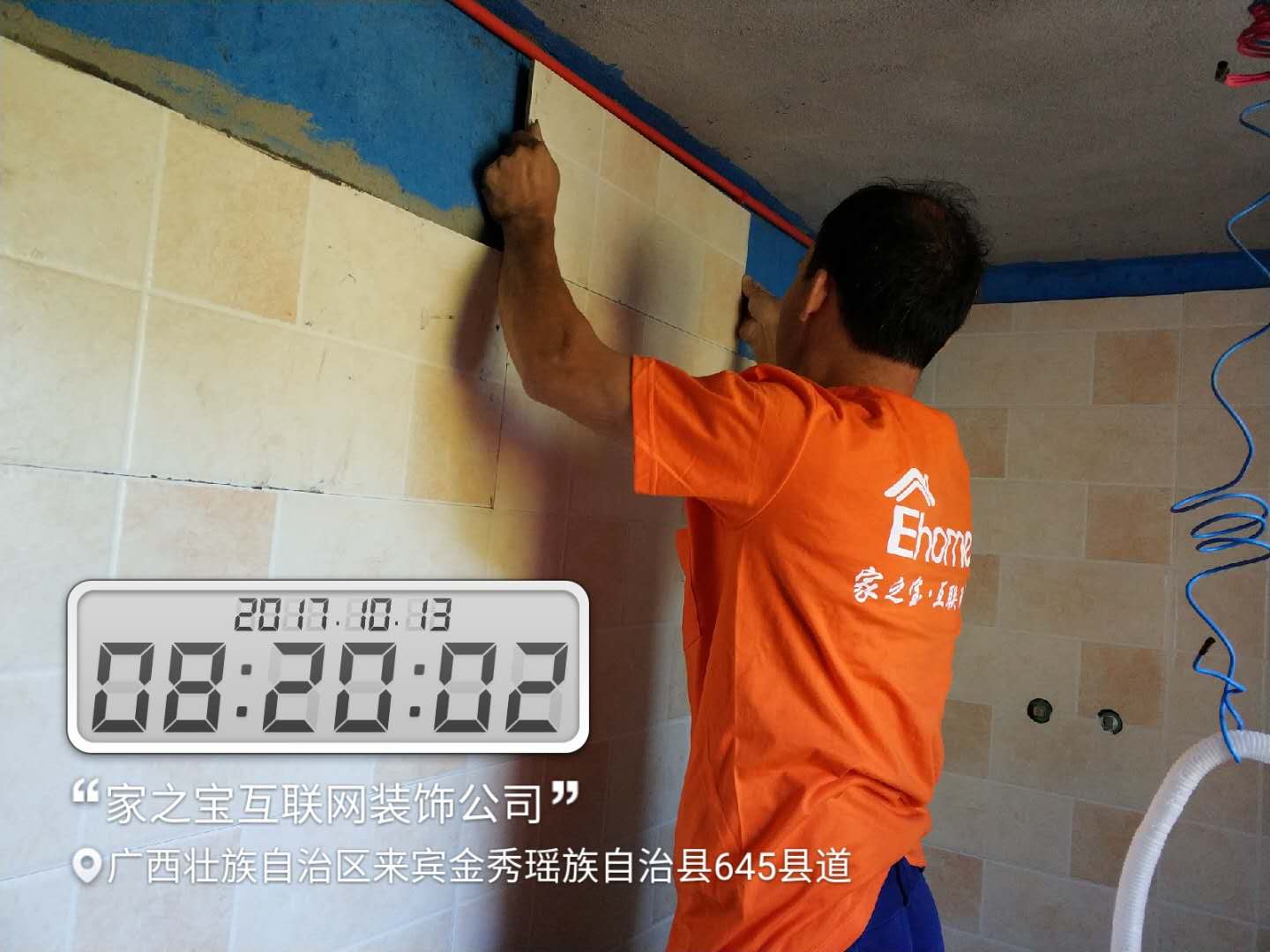 墻磚鋪貼,使用水平儀投射水平線,陽角處采用磨邊45°碰角工藝。