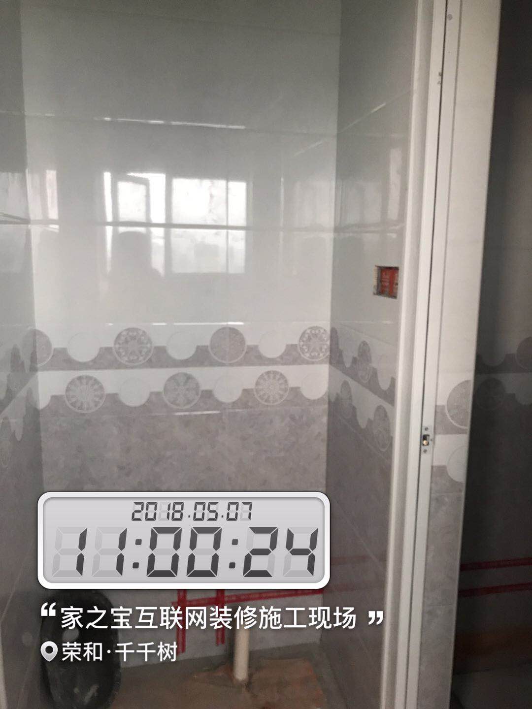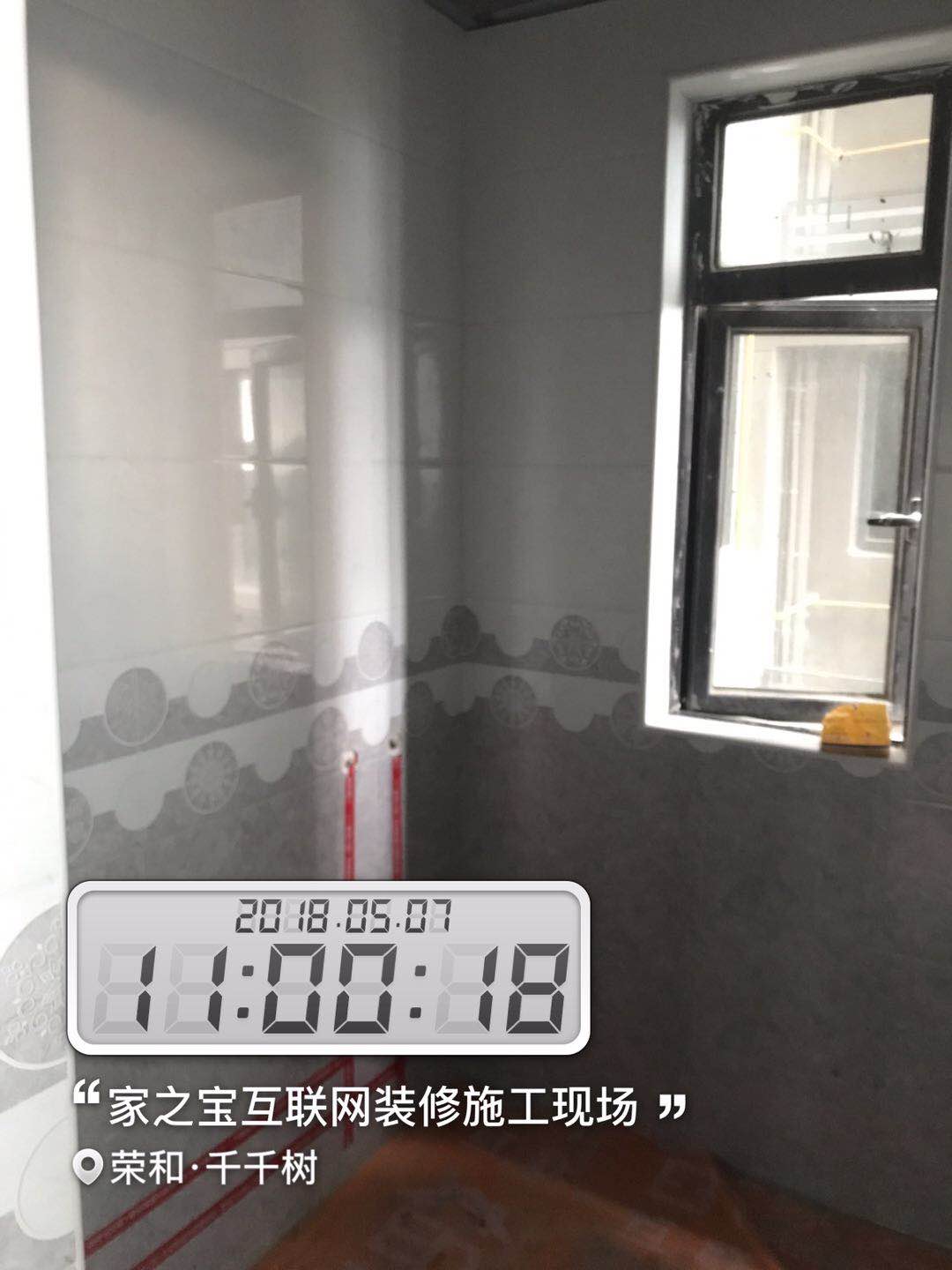 墻磚鋪貼,使用水平儀投射水平線,陽角處采用磨邊45°碰角工藝。