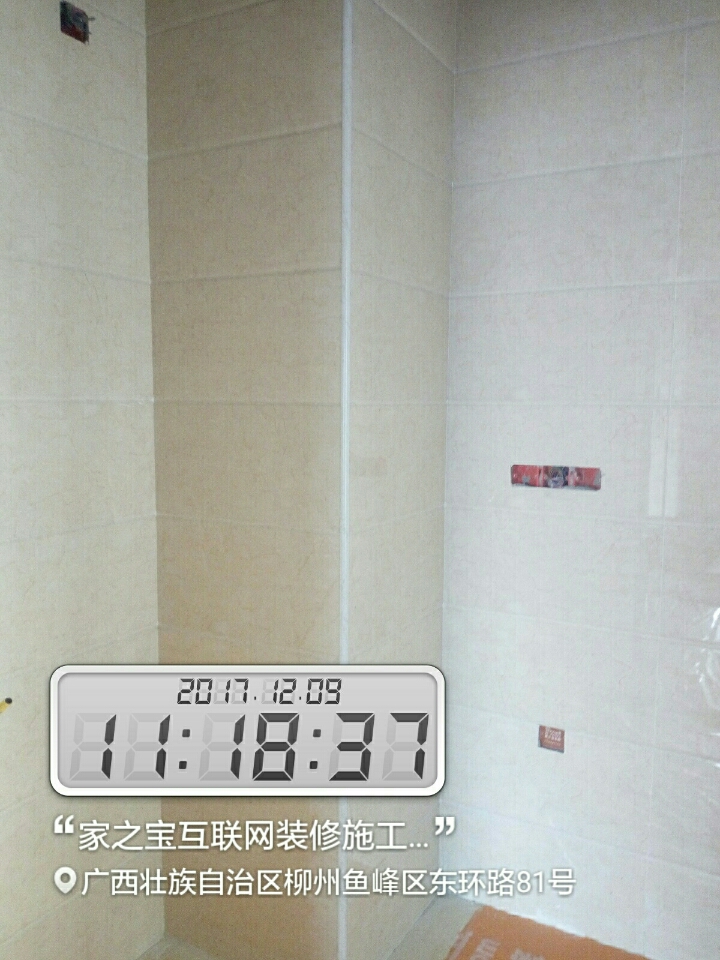 墻磚鋪貼,使用水平儀投射水平線,陽角處采用磨邊45°碰角工藝。