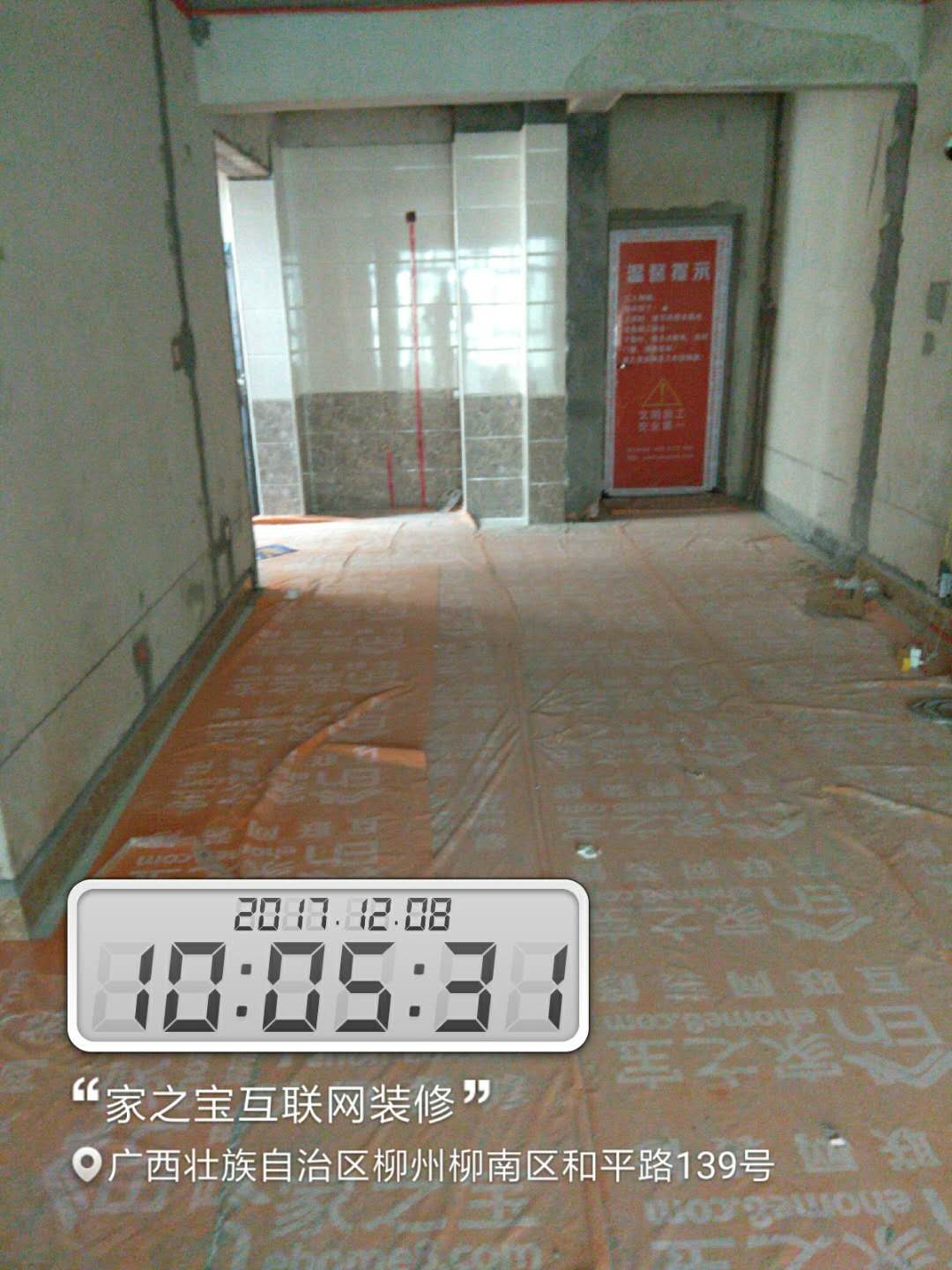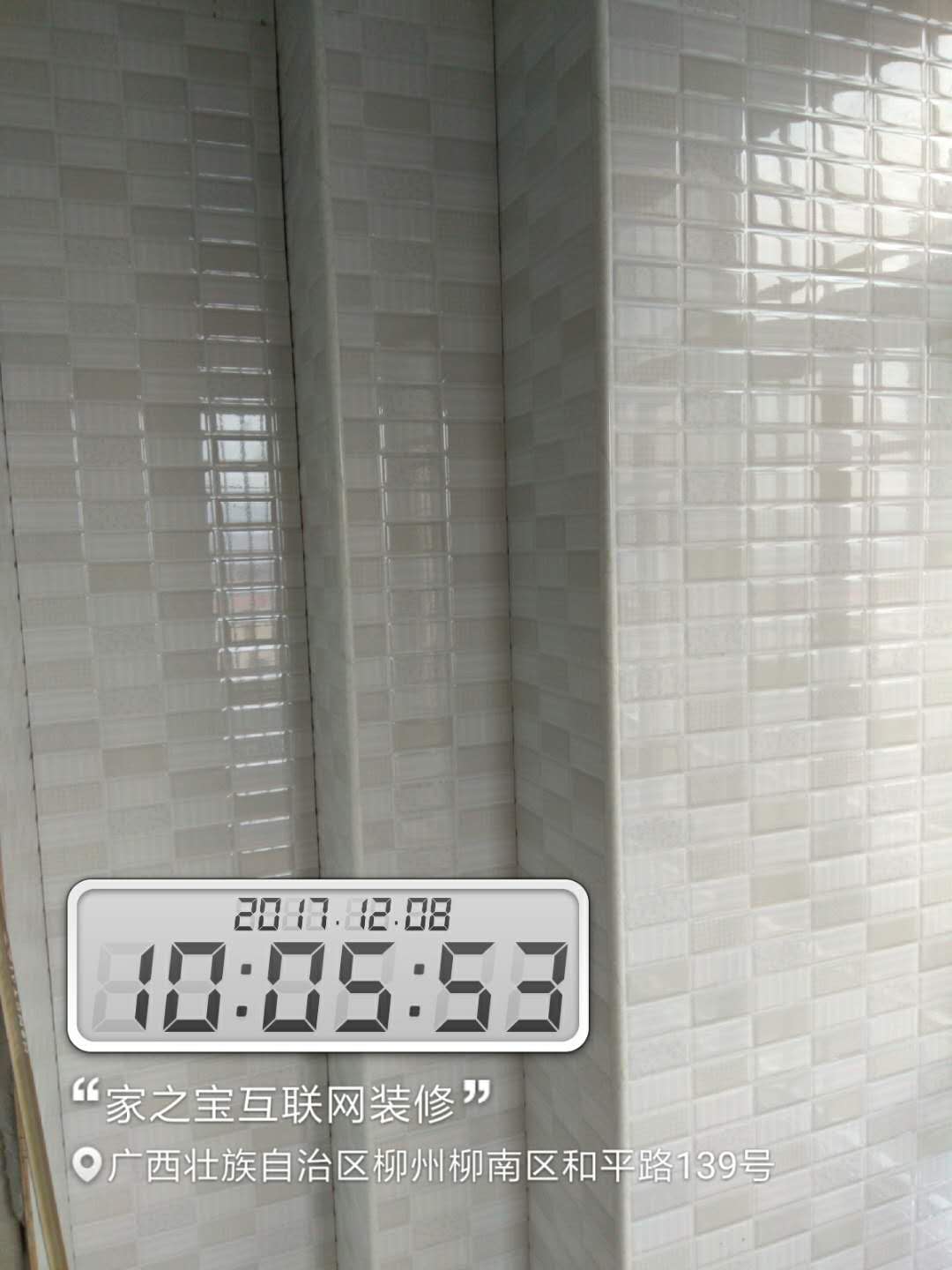 墻磚鋪貼,使用水平儀投射水平線,陽(yáng)角處采用磨邊45°碰角工藝。