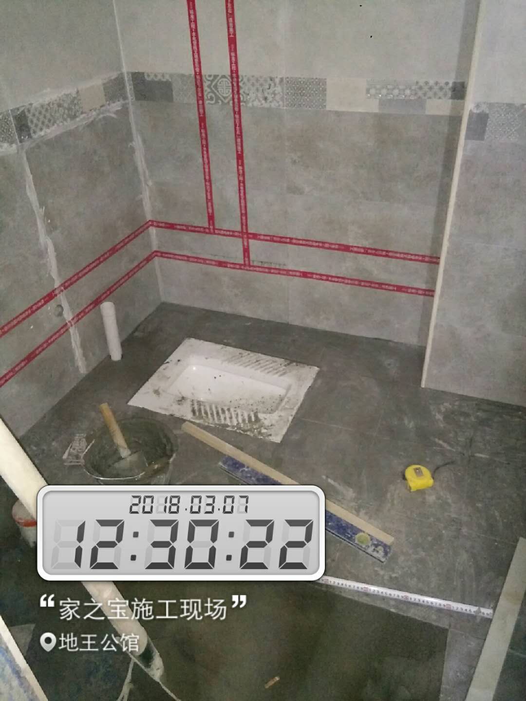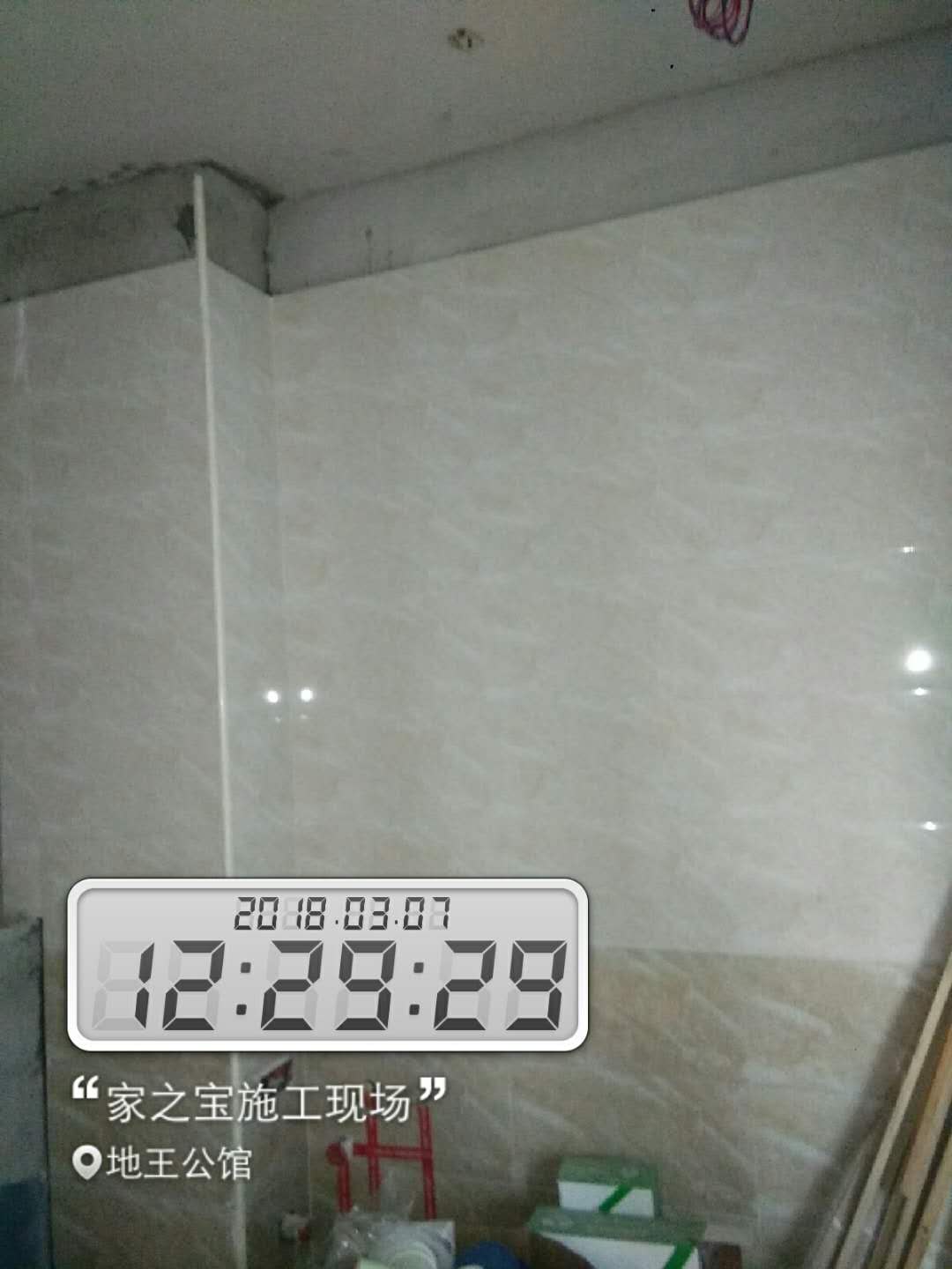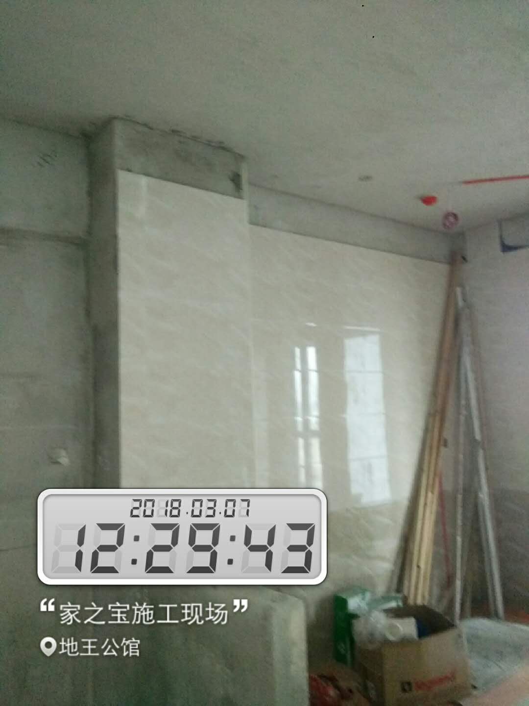 墻磚鋪貼,使用水平儀投射水平線,陽角處采用磨邊45°碰角工藝。
