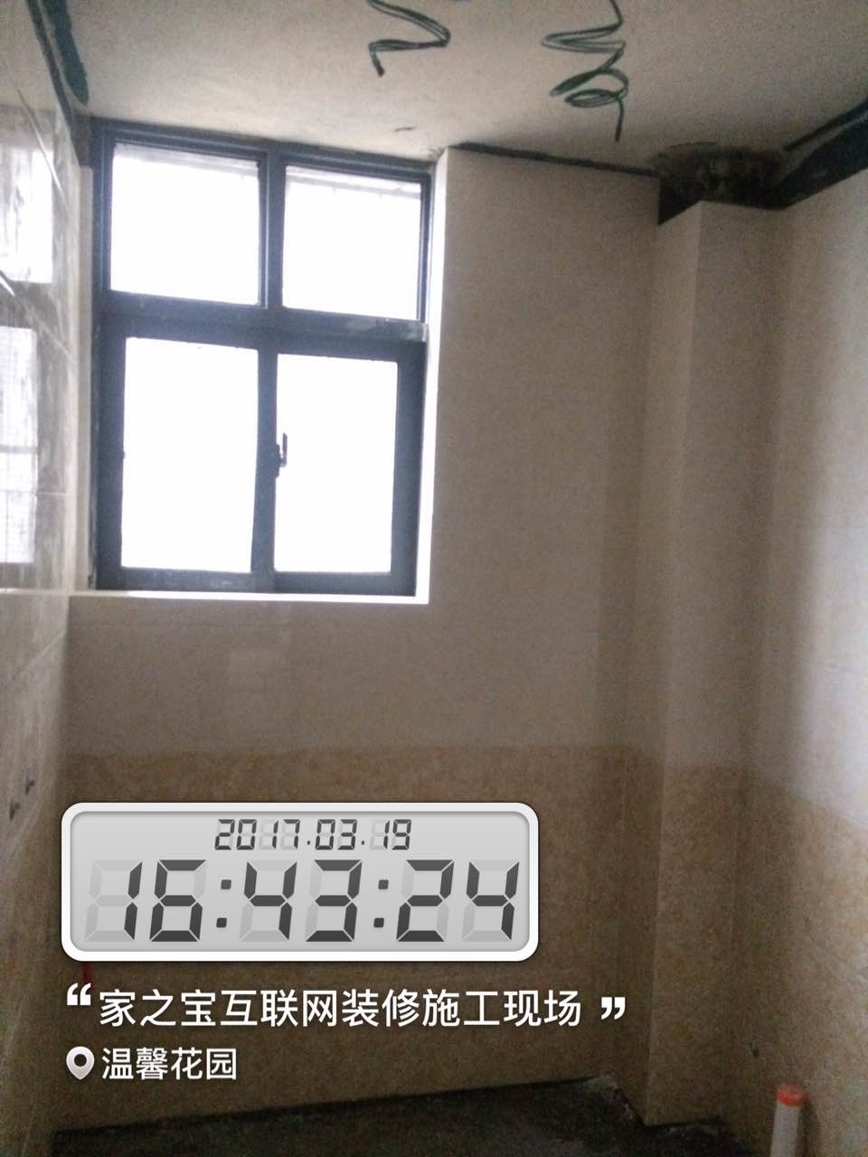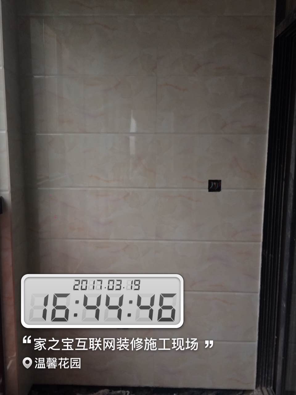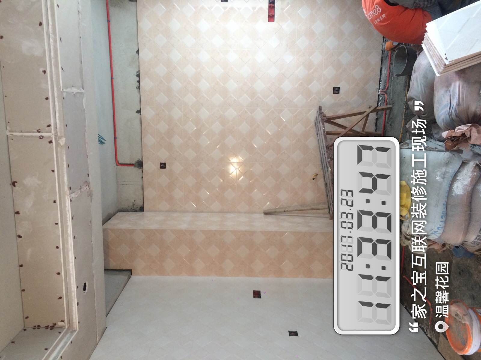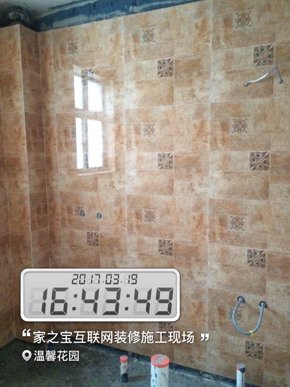 墻磚鋪貼,使用水平儀投射水平線,陽角處采用磨邊45°碰角工藝。