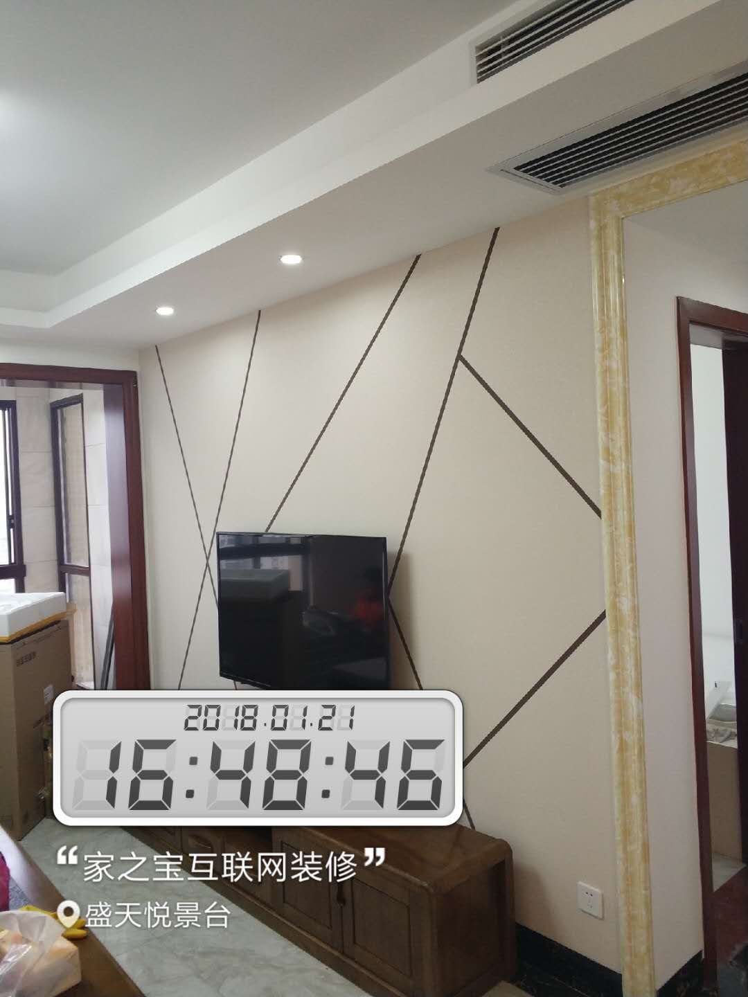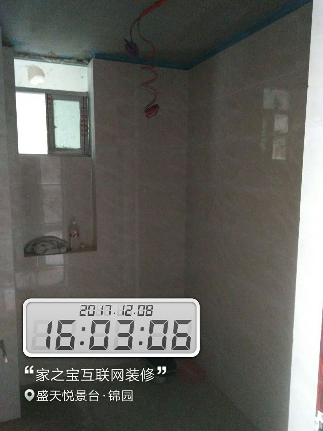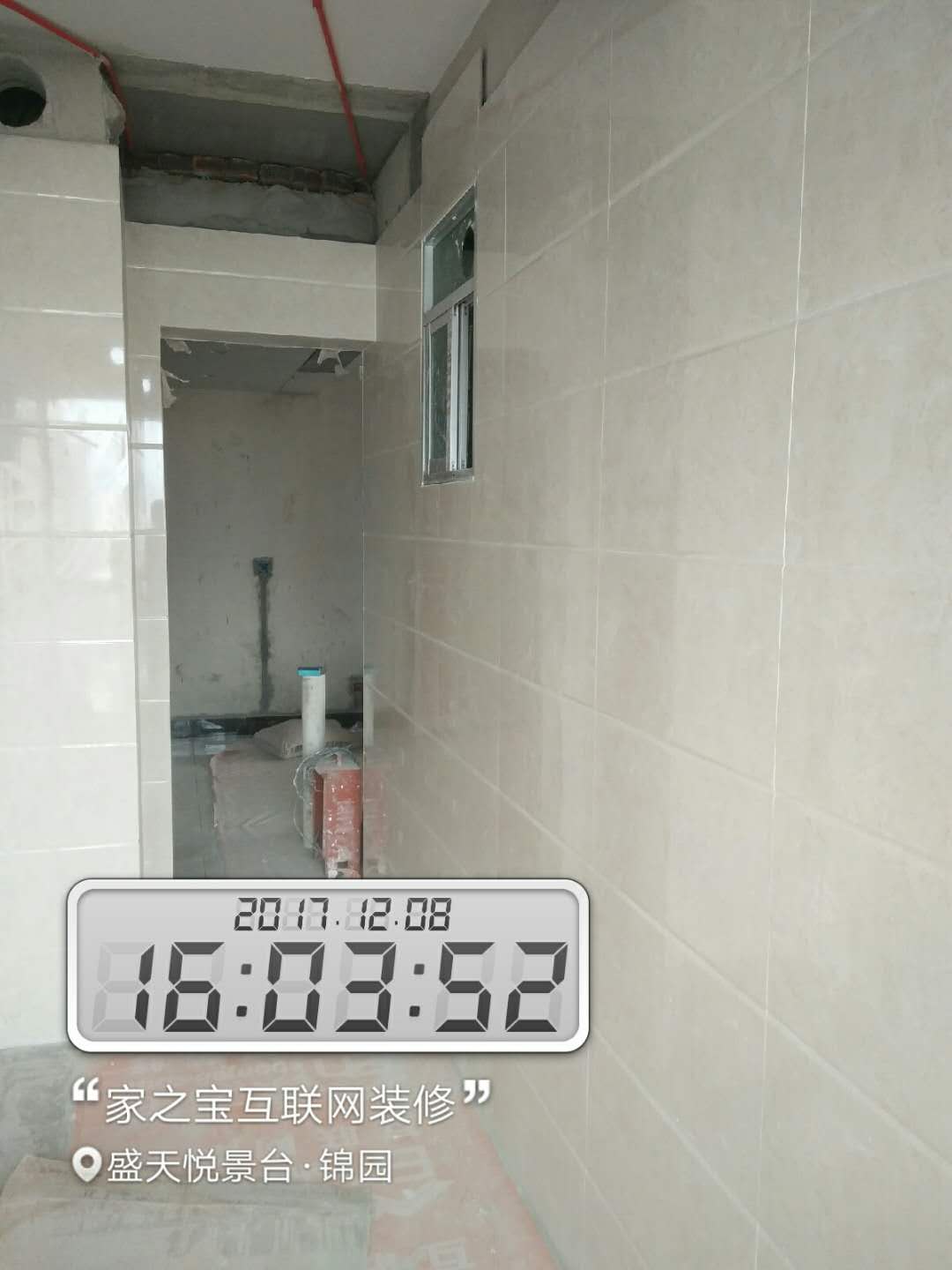 墻磚鋪貼,使用水平儀投射水平線,陽角處采用磨邊45°碰角工藝。
