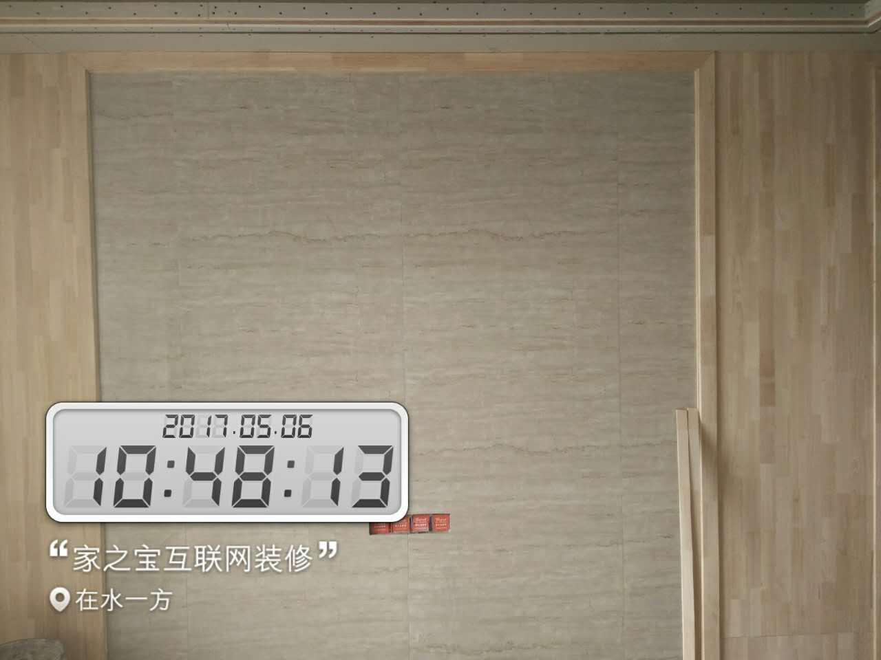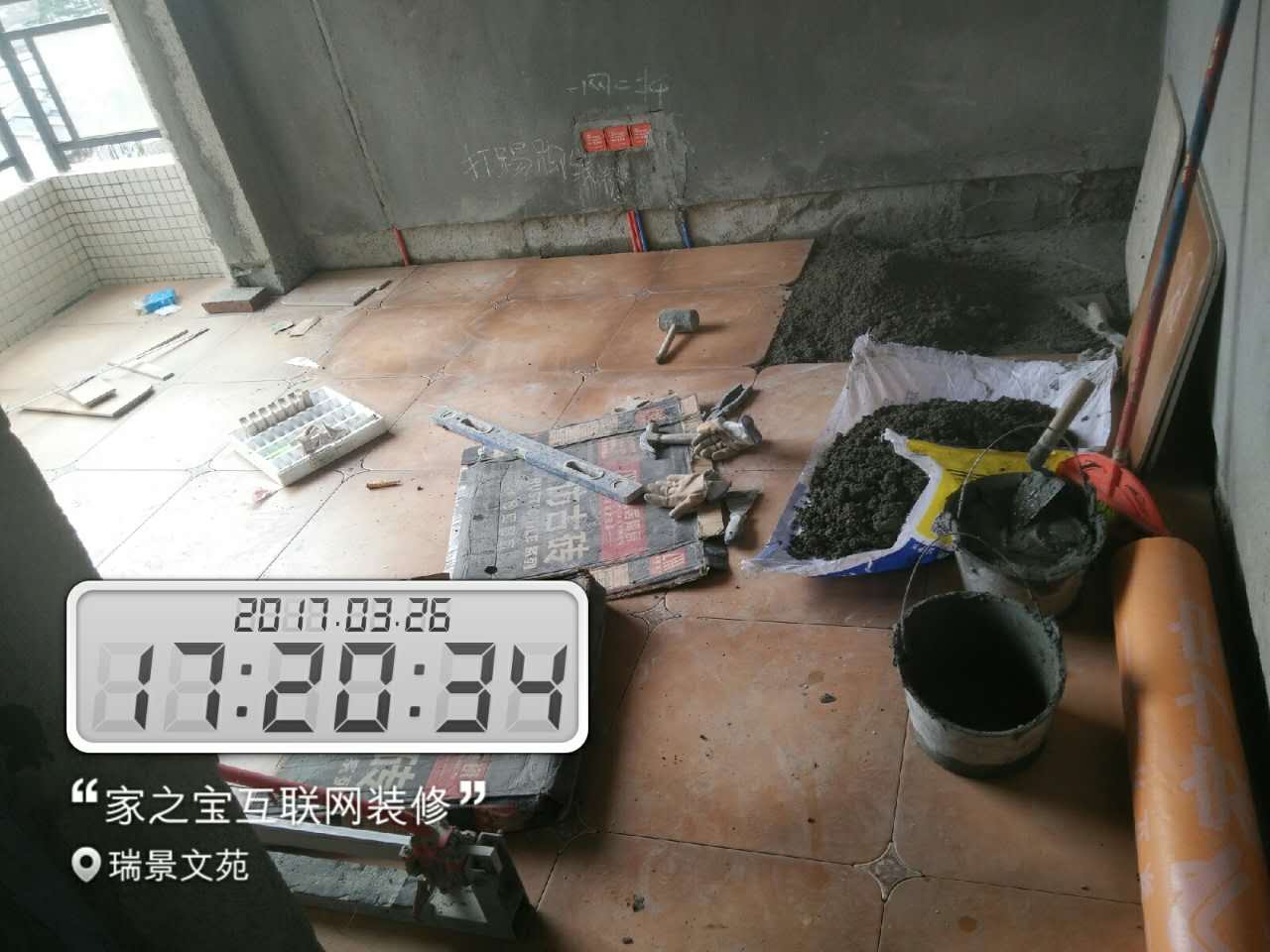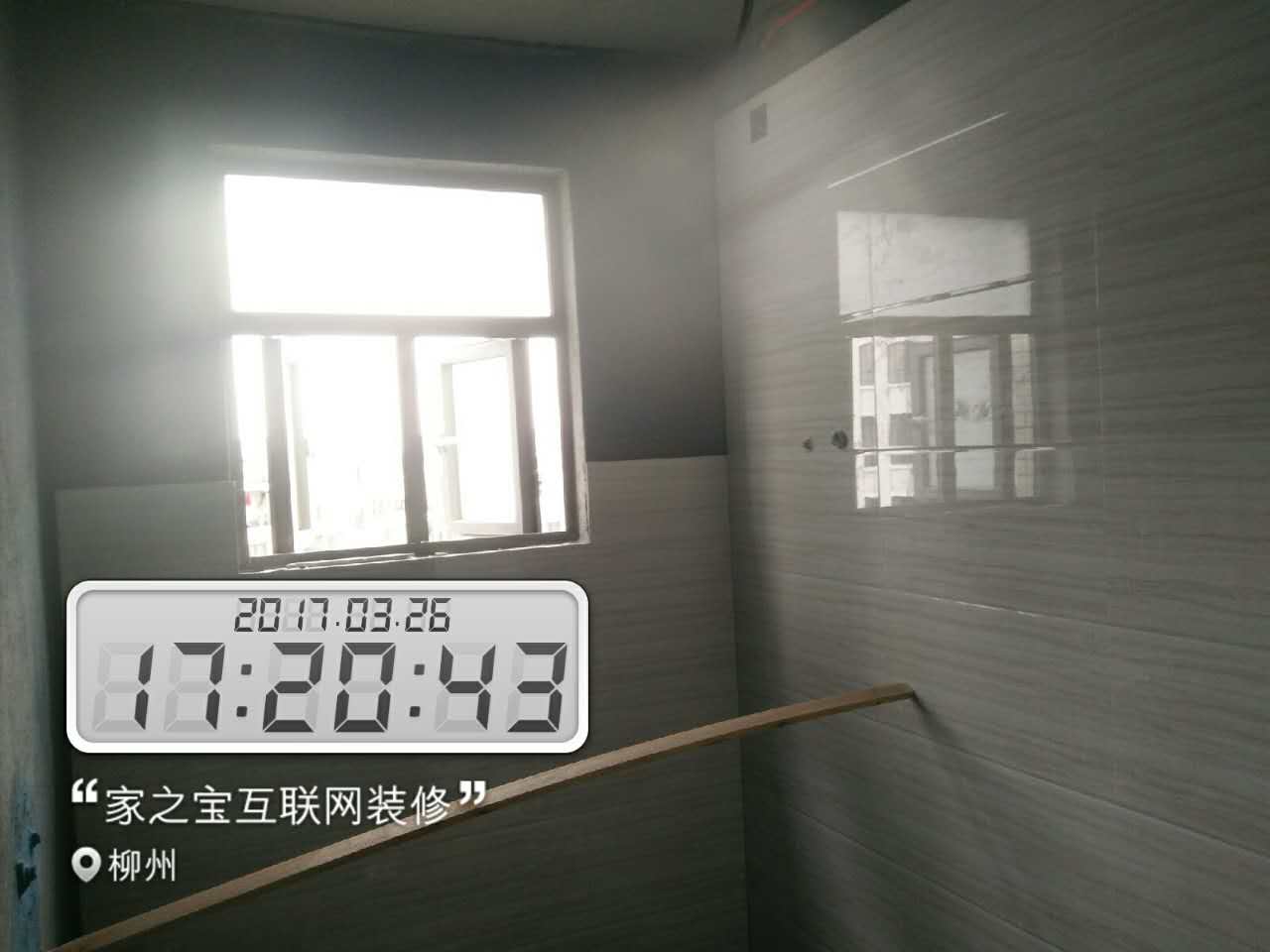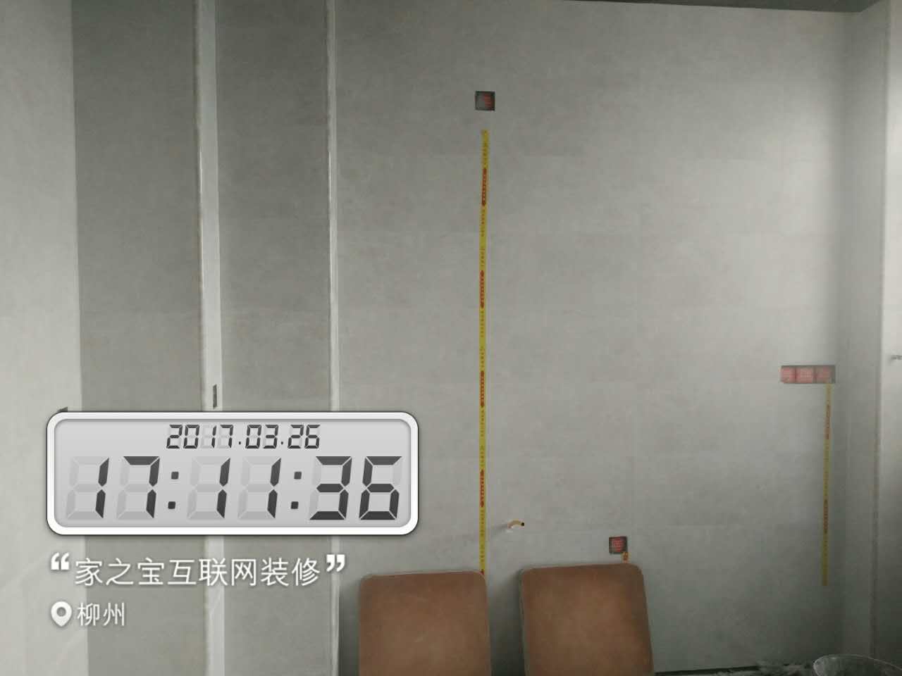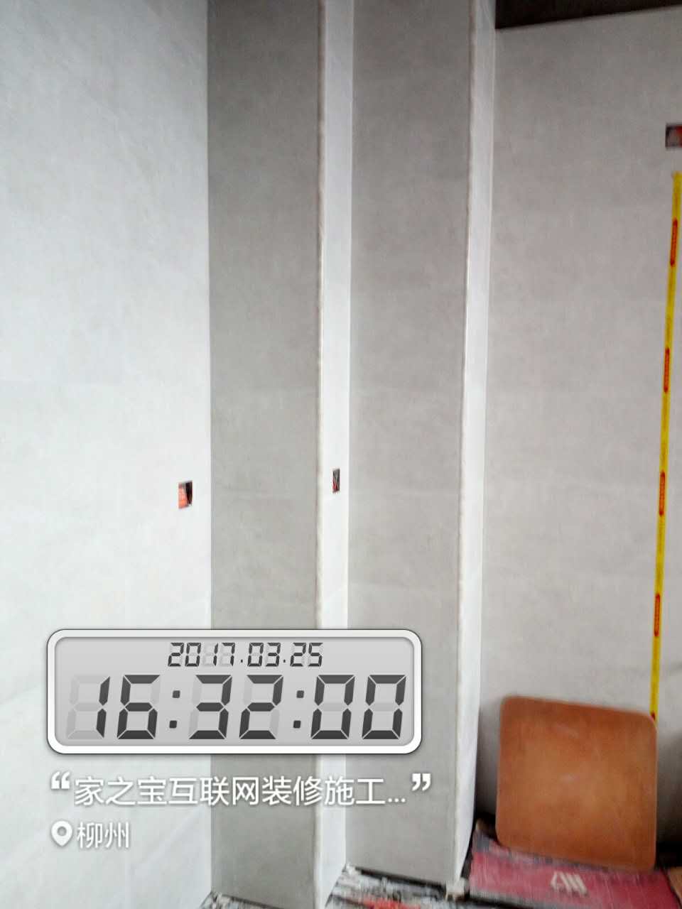 墻磚鋪貼,使用水平儀投射水平線,陽角處采用磨邊45°碰角工藝。