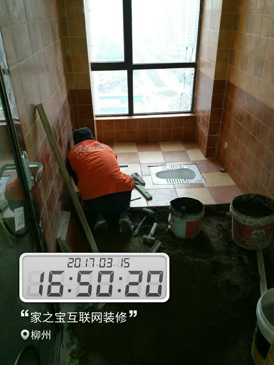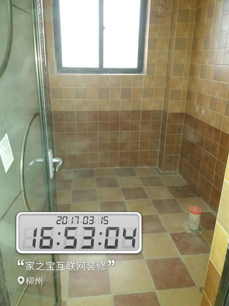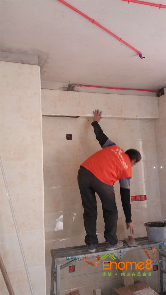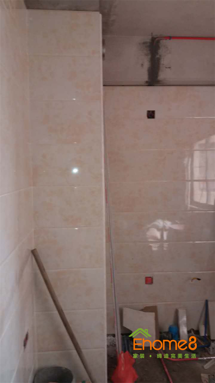 墻磚鋪貼,使用水平儀投射水平線,陽角處采用磨邊45°碰角工藝。墻磚鋪貼完畢。