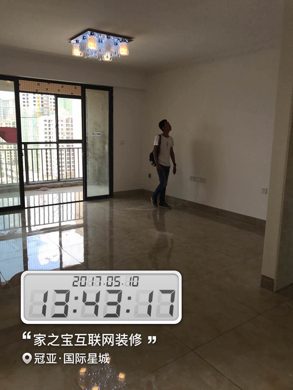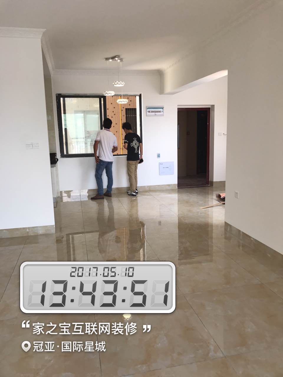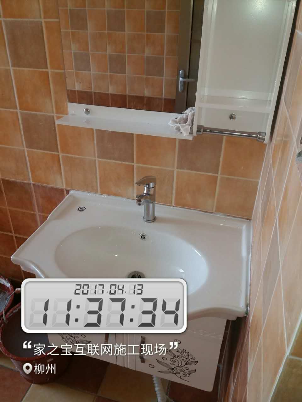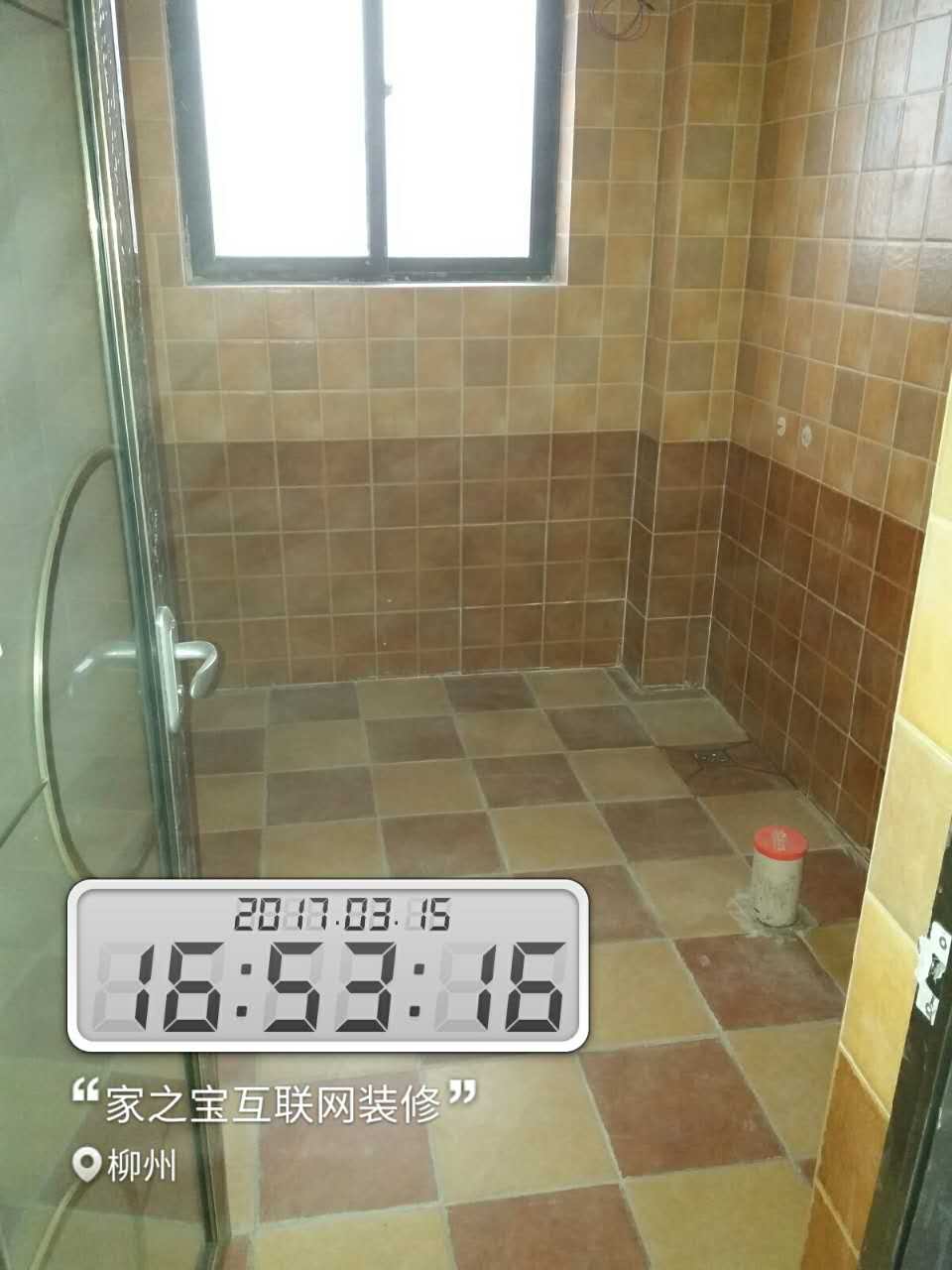 墻磚鋪貼,使用水平儀投射水平線,陽角處采用磨邊45°碰角工藝。墻磚鋪貼完畢。