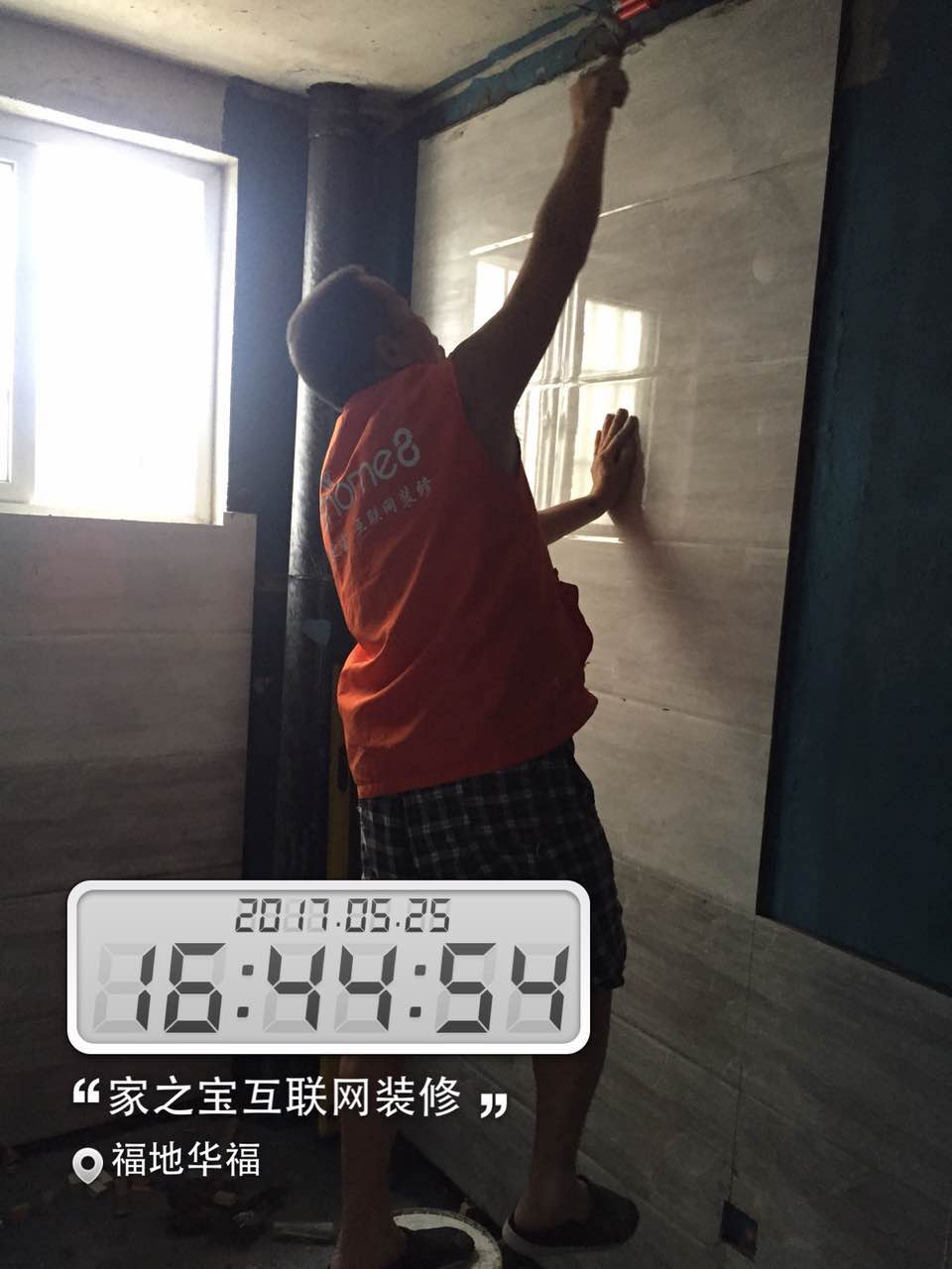 墻磚鋪貼,使用水平儀投射水平線,陽角處采用磨邊45°碰角工藝。