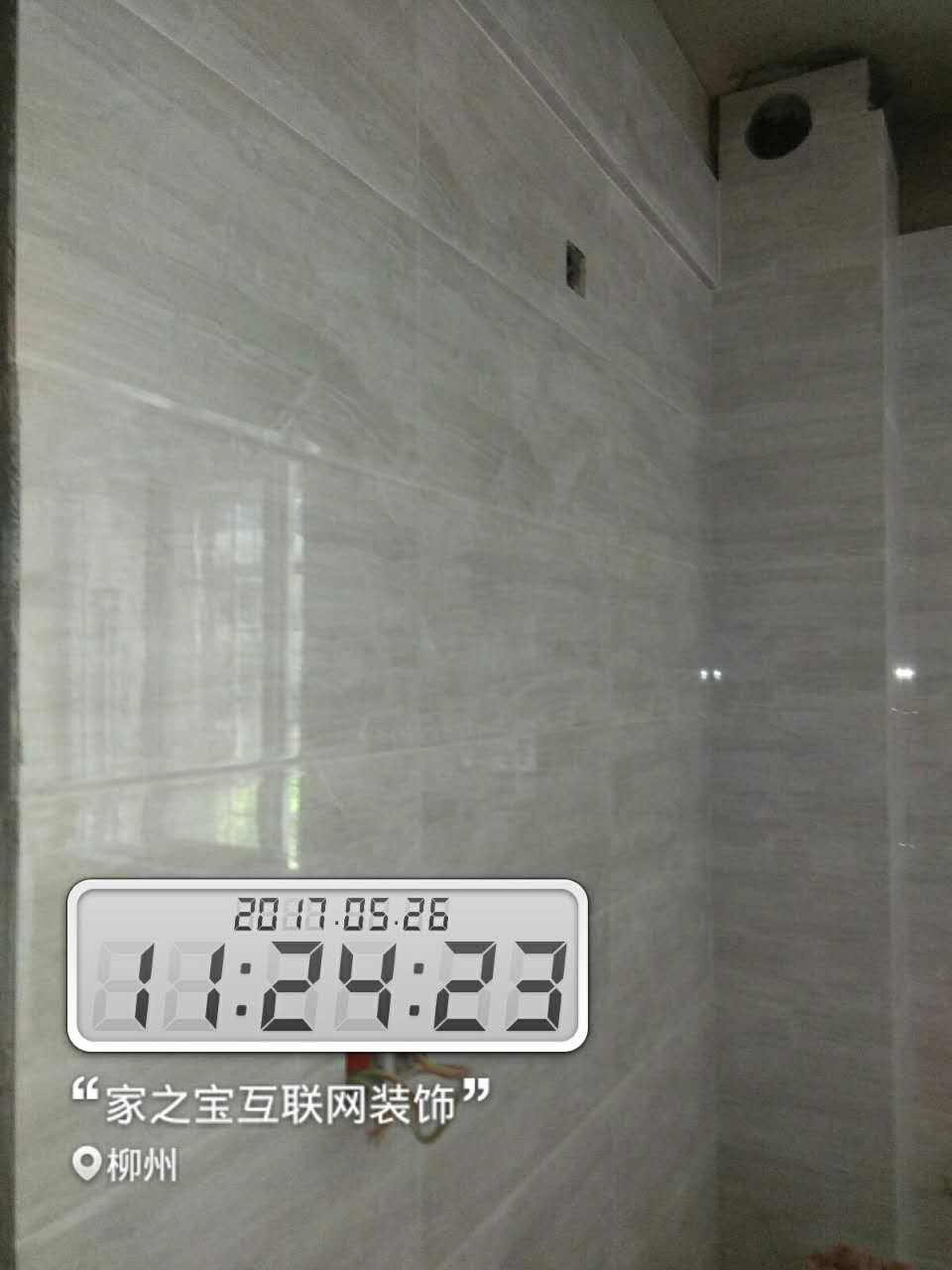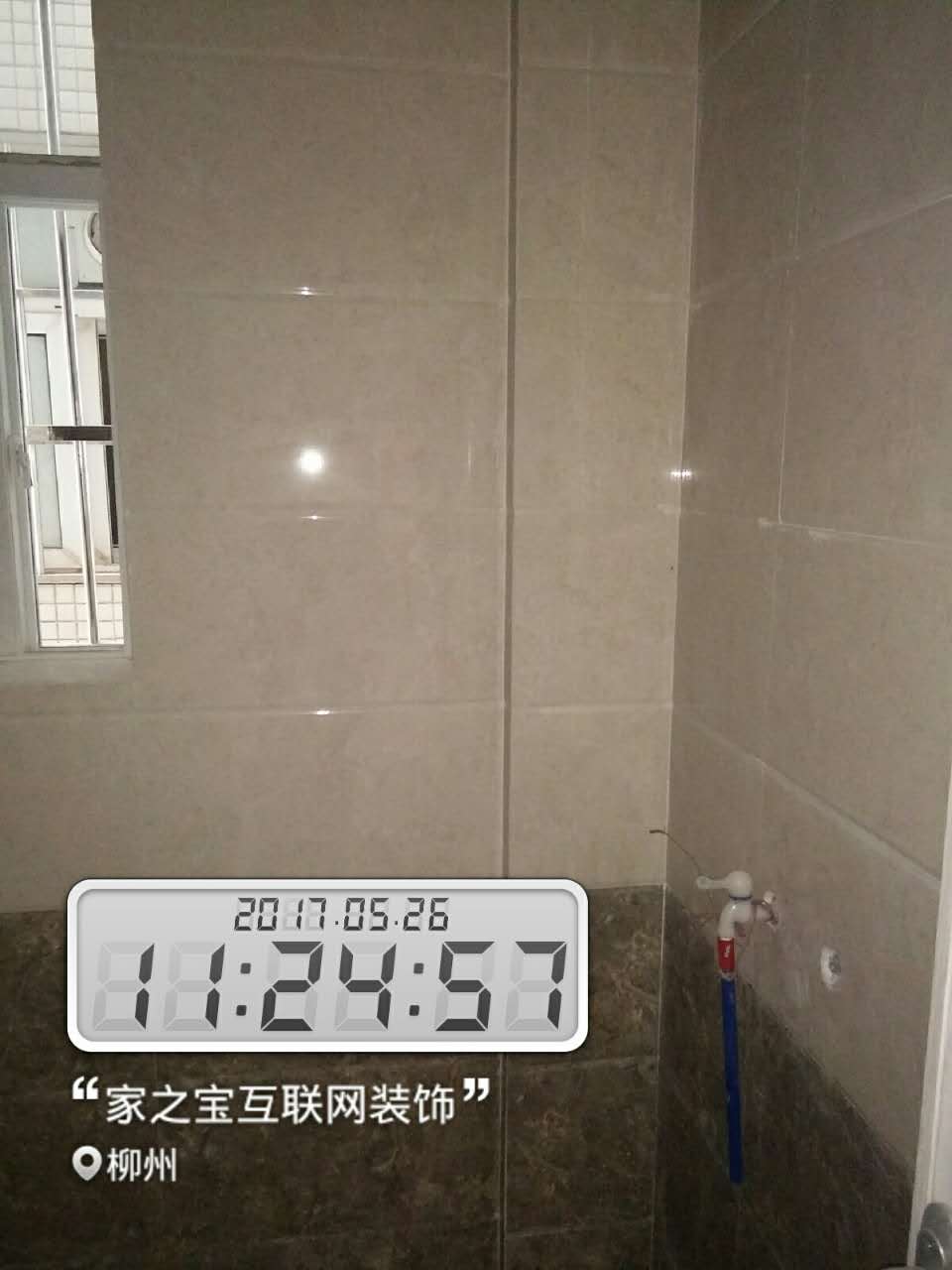 墻磚鋪貼,使用水平儀投射水平線,陽角處采用磨邊45°碰角工藝。