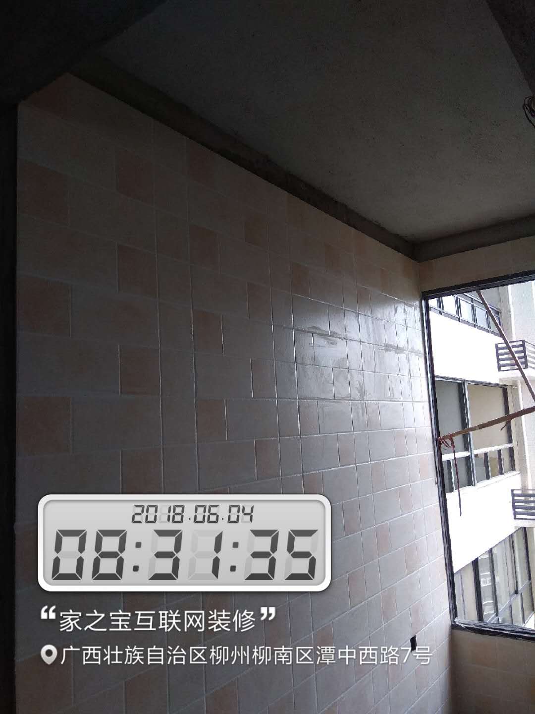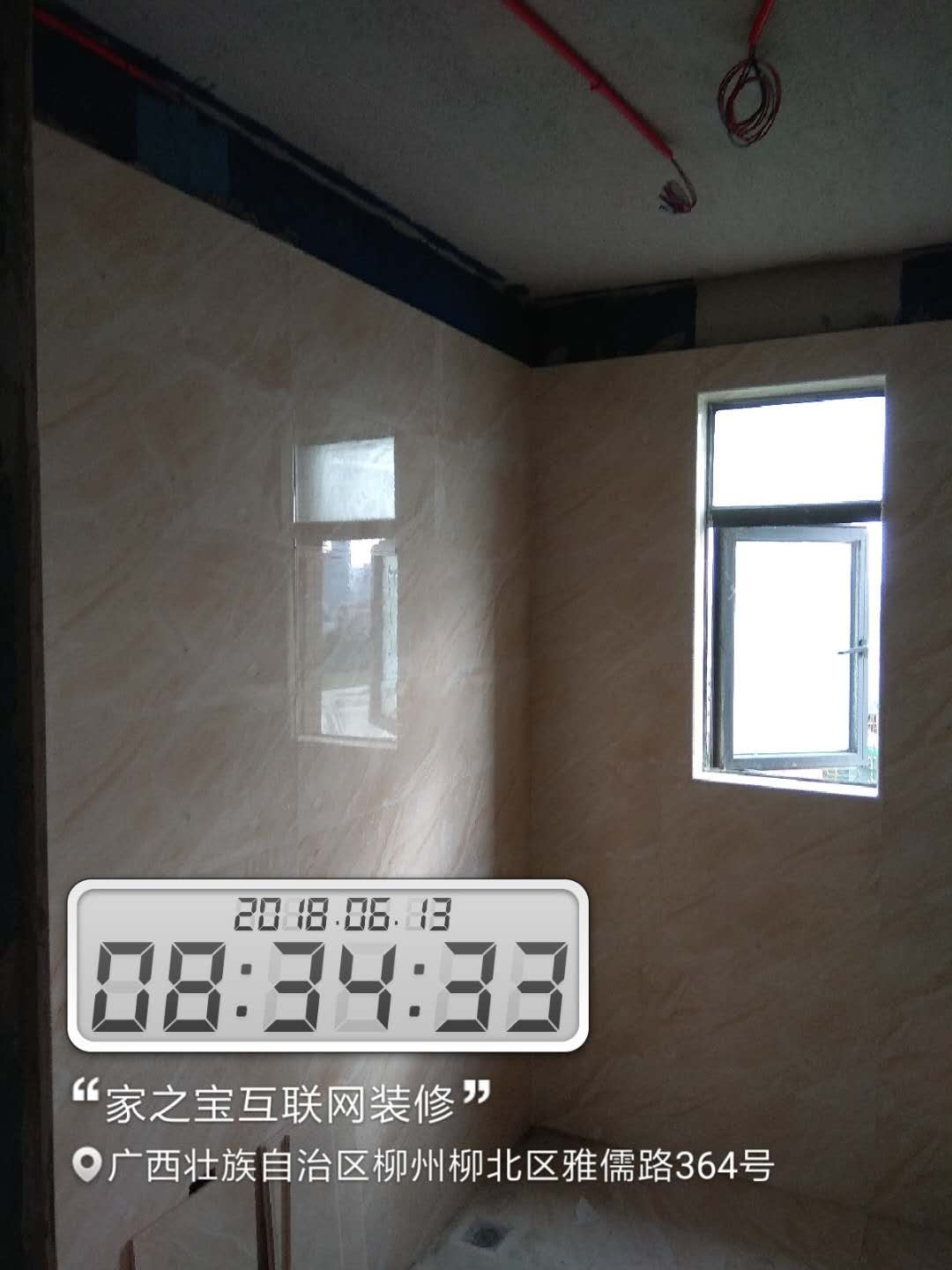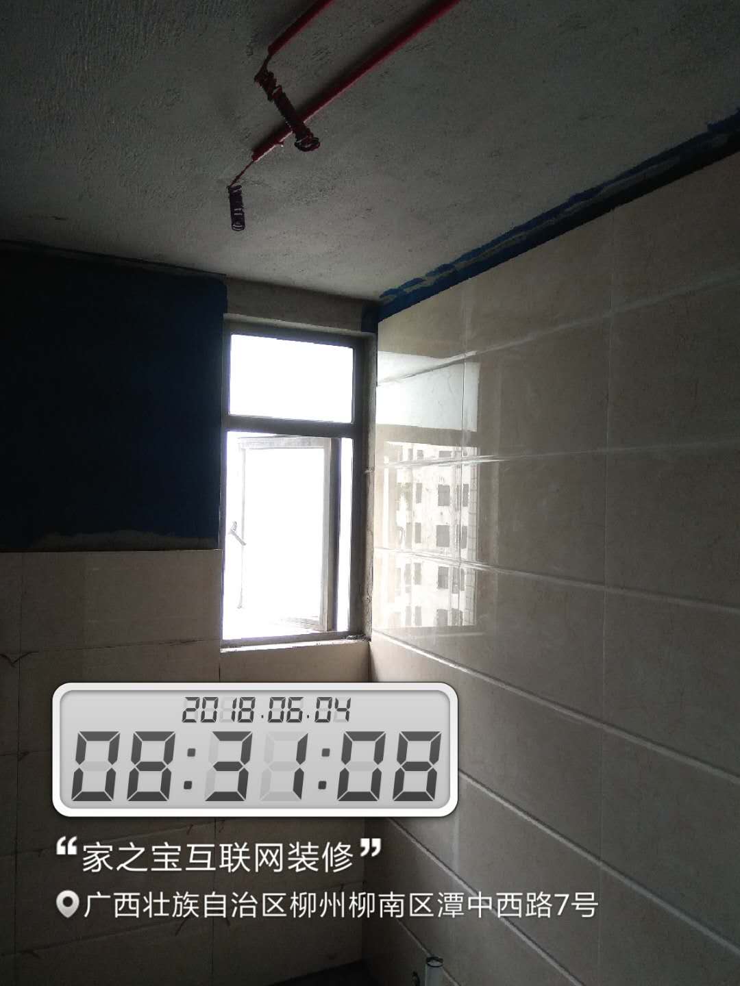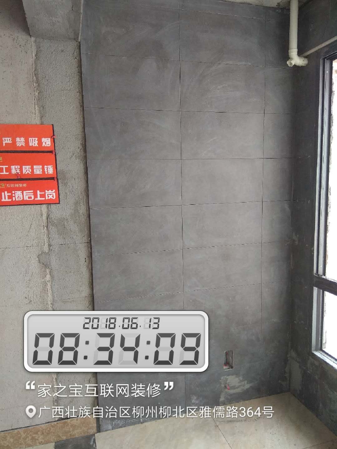 墻磚鋪貼,使用水平儀投射水平線,陽角處采用磨邊45°碰角工藝。