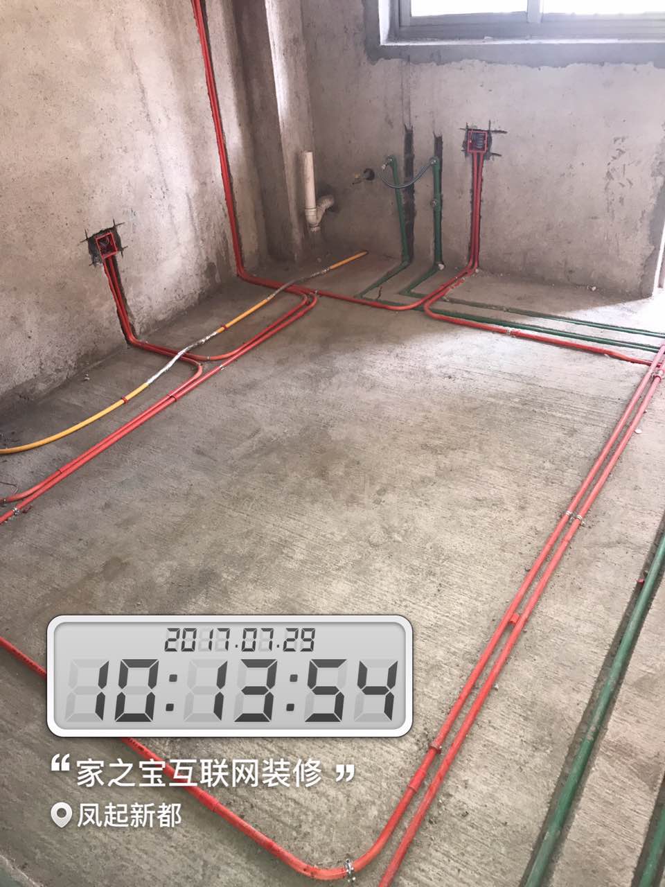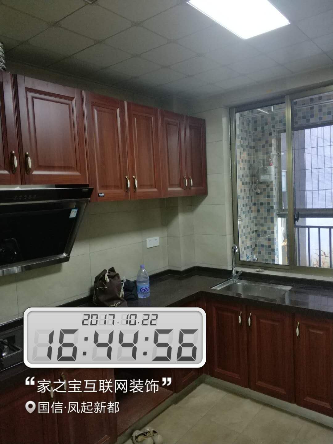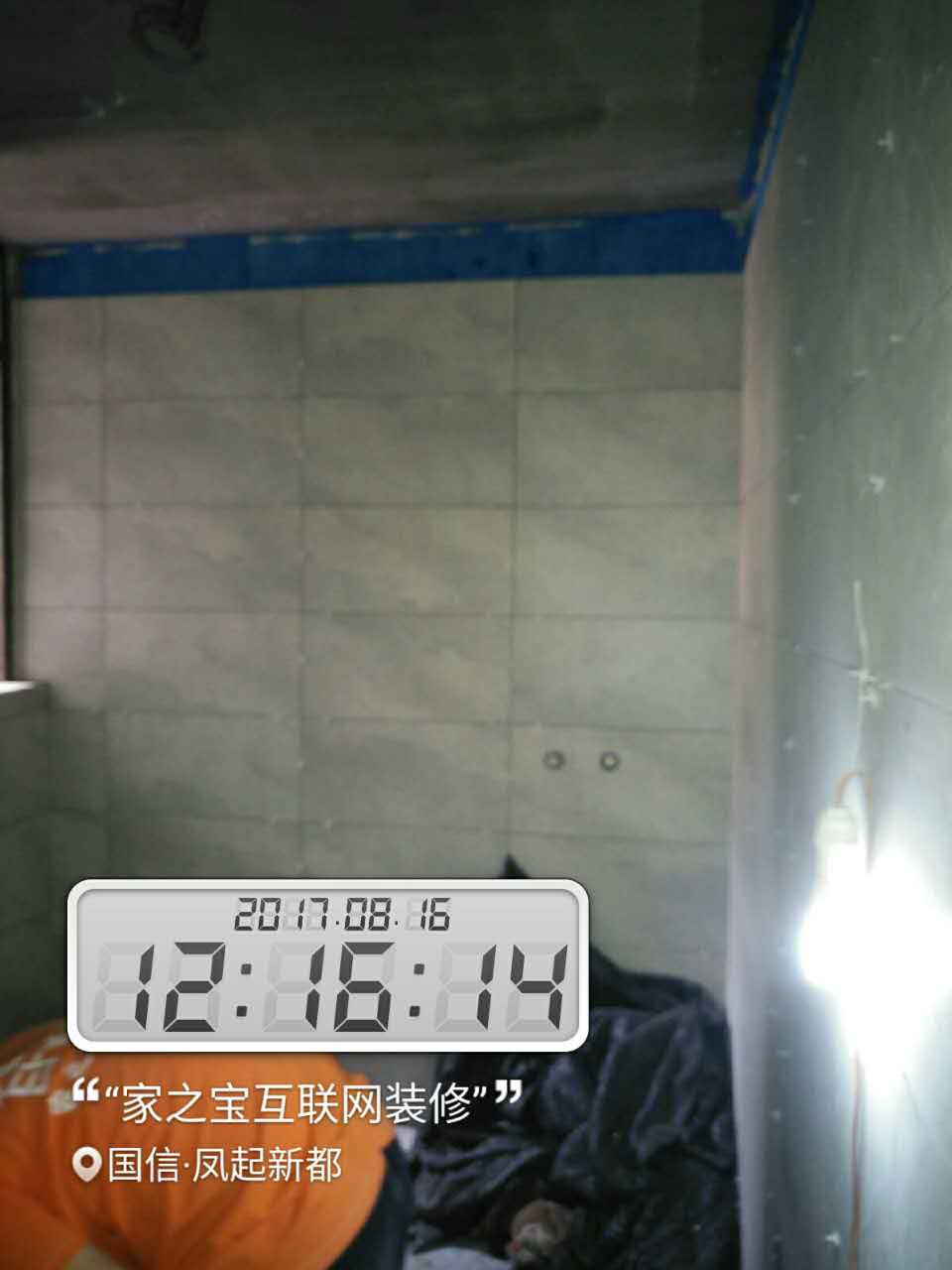 墻磚鋪貼,使用水平儀投射水平線,陽角處采用磨邊45°碰角工藝。