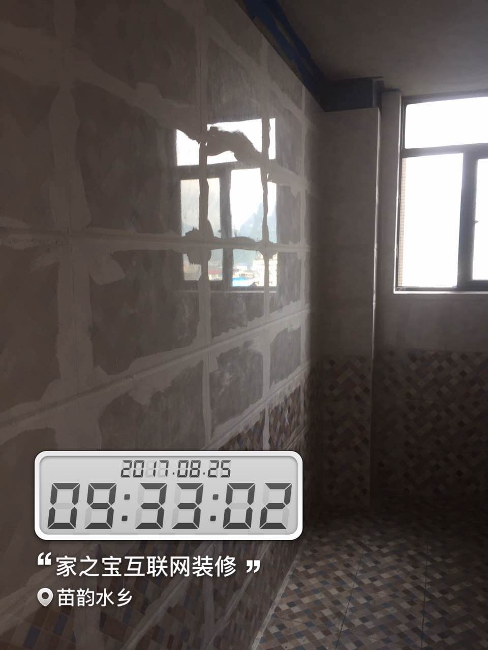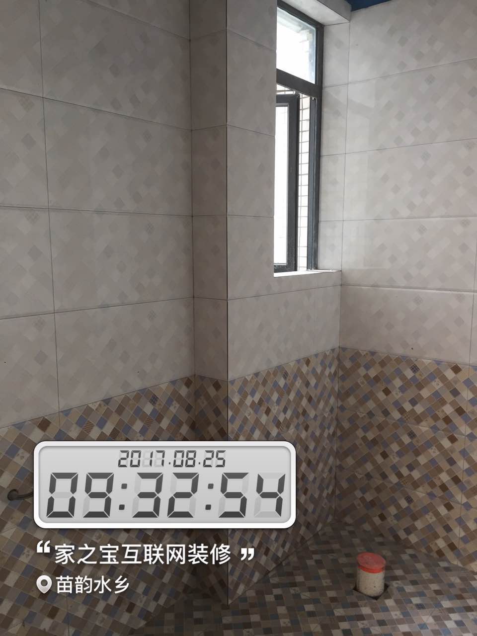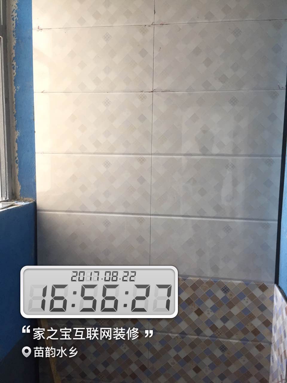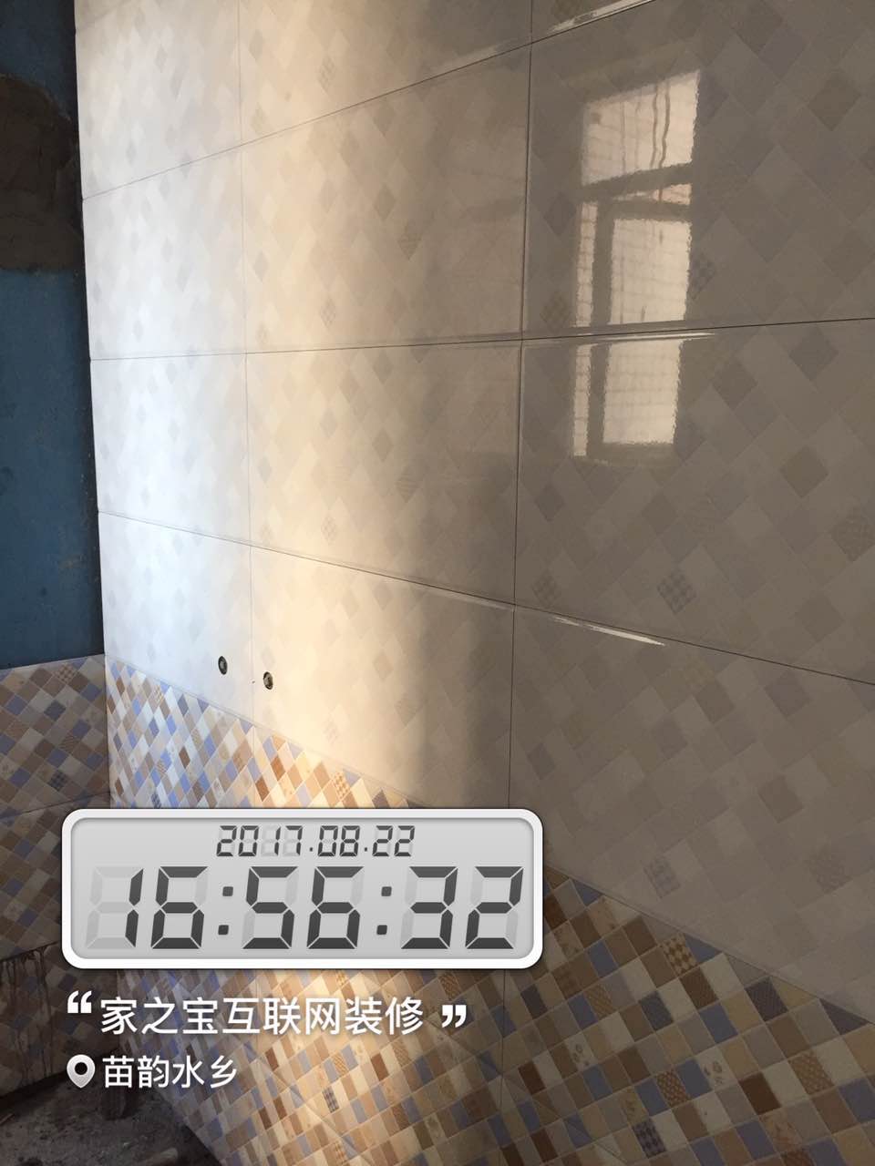 墻磚鋪貼,使用水平儀投射水平線,陽(yáng)角處采用磨邊45°碰角工藝。