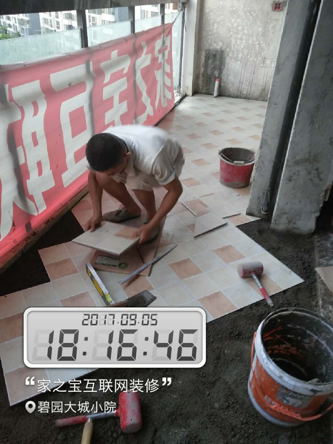 墻磚鋪貼,使用水平儀投射水平線,陽角處采用磨邊45°碰角工藝。
