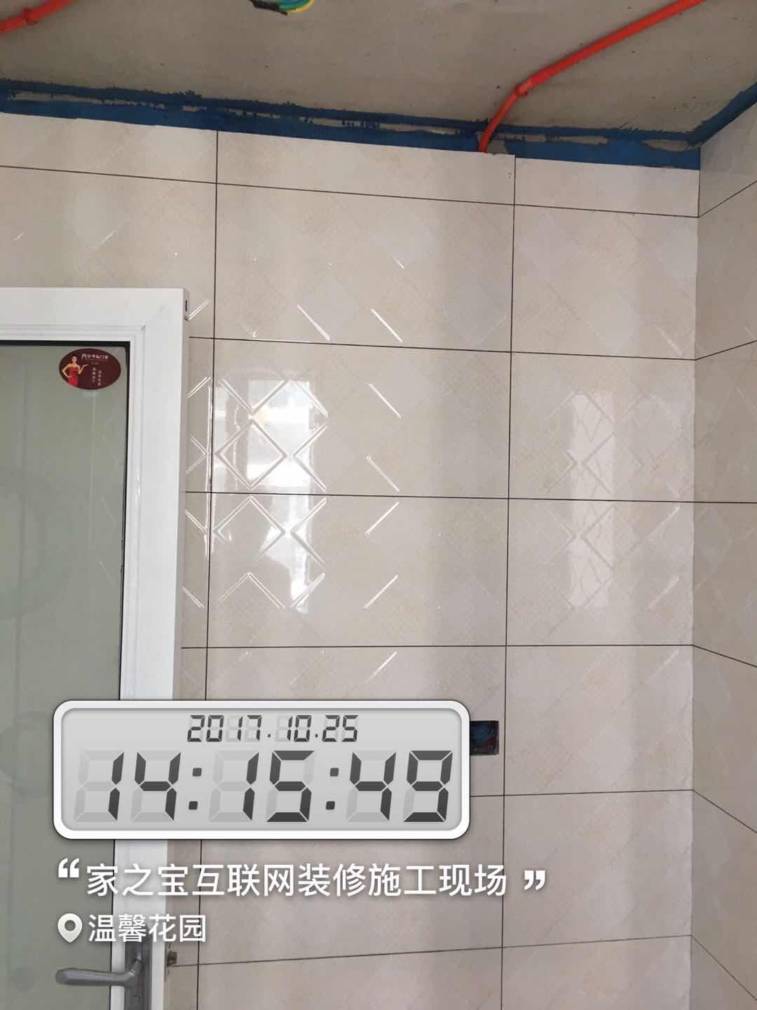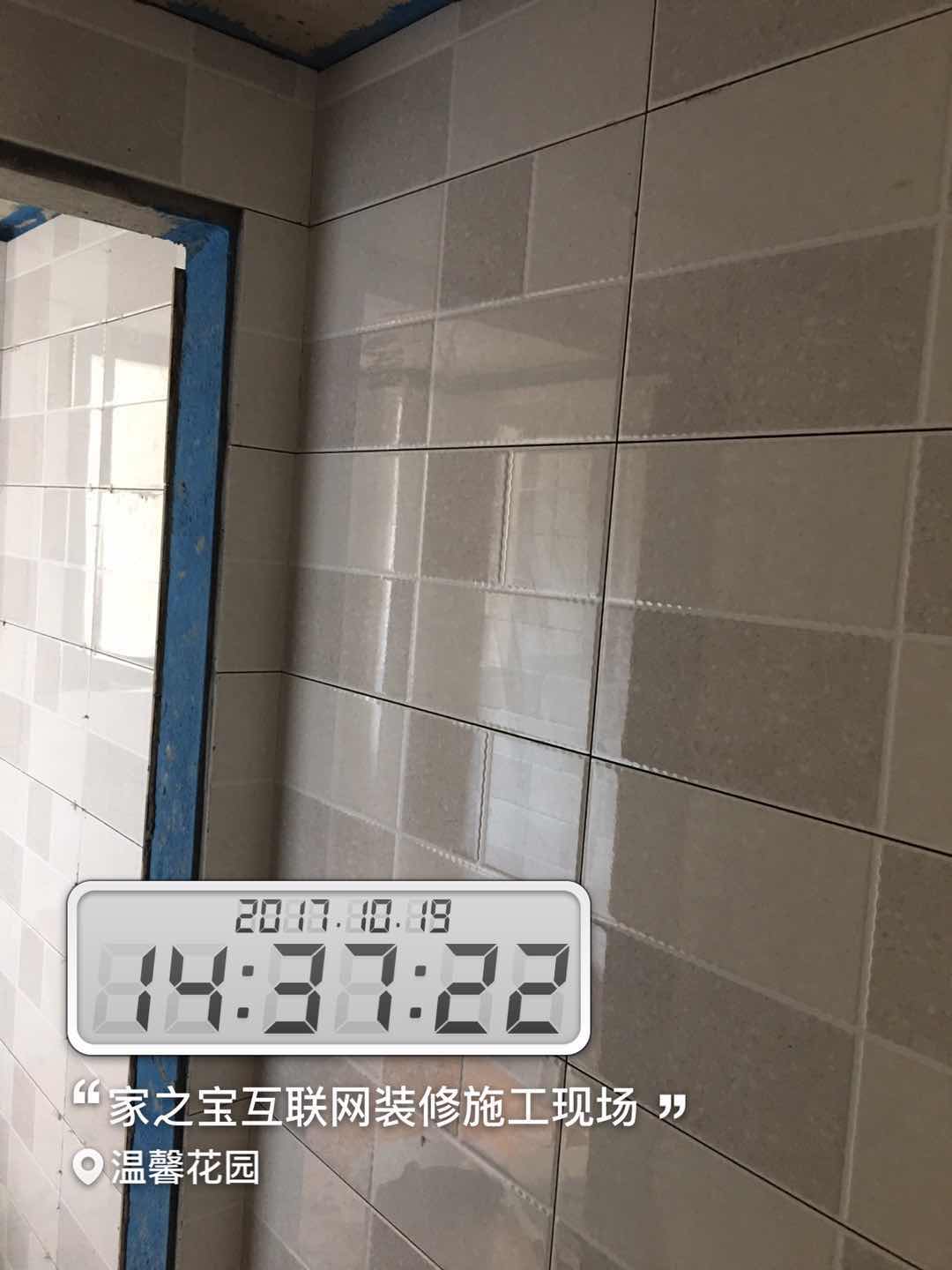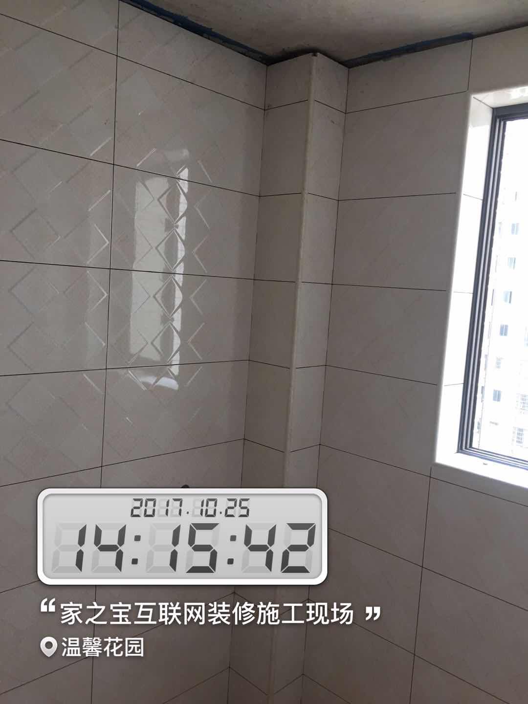 墻磚鋪貼,使用水平儀投射水平線,陽角處采用磨邊45°碰角工藝。