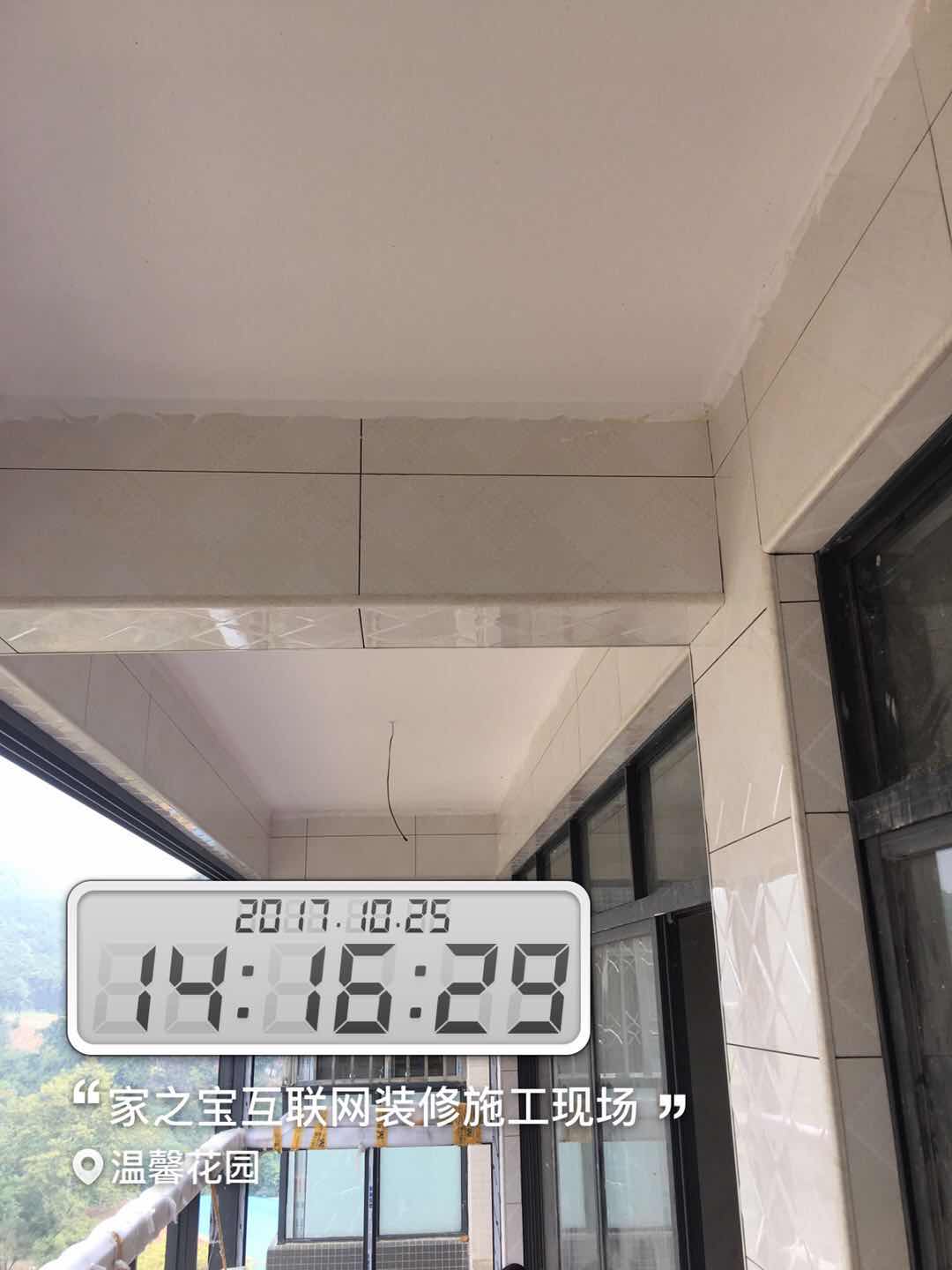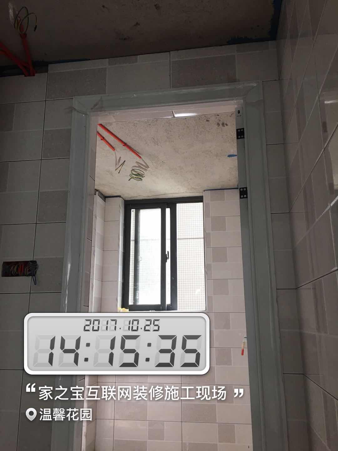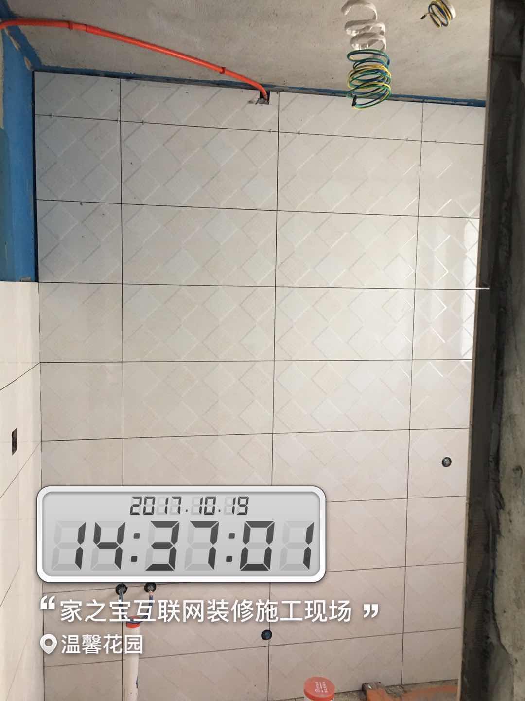 墻磚鋪貼,使用水平儀投射水平線,陽角處采用磨邊45°碰角工藝。